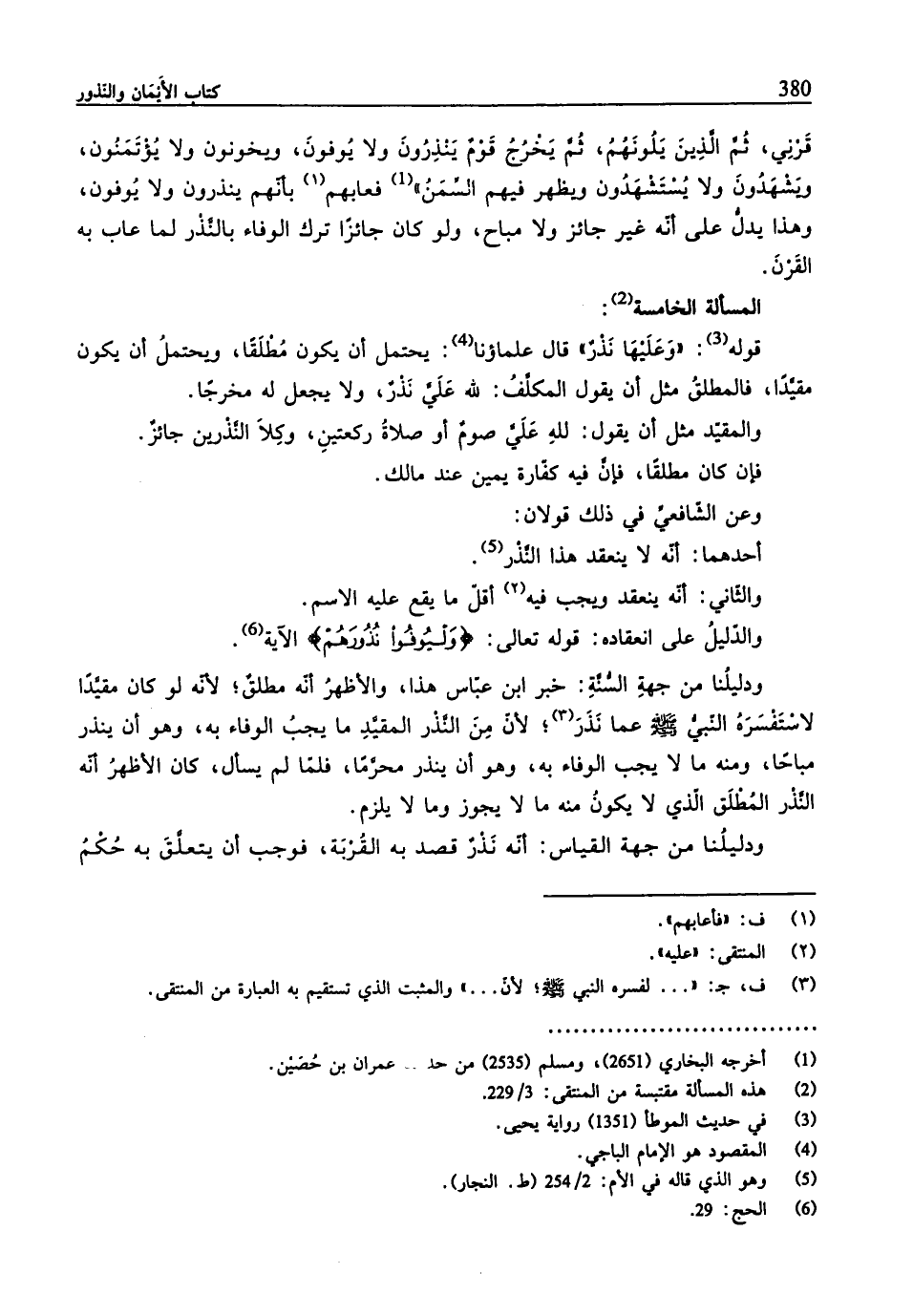 قَرْنِي، ثُمَّ الَّذينَ يَلُونَهُمُ، ثُمَّ يَخرُجُ قوْمٌ يَنْذِرُونَ ولا يُوفونَ، ويخونون ولا يُؤتَمَنُون، ويَشْهَدُونَ ولا يُسْتَشْهَدُون ويظهر فيهم السِّمَنُ" (¬1) فعابهم بأنّهّم ينذرون ولا يُوفون، وهذا يدلُّ على أنّه غير جائز ولا مباح، ولو كان جائزًا ترك الوفاء بالنَّذْر لما عاب به القَرْنَ.