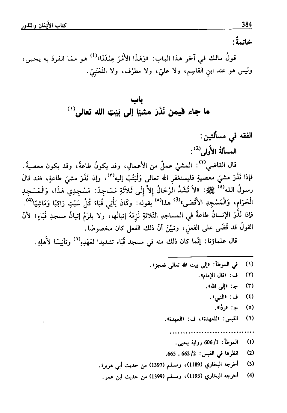 قال القاضي: المشيُ عملٌ من الأعمالِ، وقد يكونُ طاعةً، وقد يكون معصيةً. فإذا نَذَرَ مشي معصيةٍ فليستغفرِ الله تعالى وَليَتُبْ إليه، وإذا نَذَرَ مشيَ طاعةٍ، فقد قالَ رسولُ الله - صلّى الله عليه وسلم -:"لَا تُشَدُّ الرِّحَالُ إِلَّا إِلَى ثَلَاثَةِ مَسَاجِدَ: مَسجِدِي هَذَا، وَالمَسْجِدِ الحَرَامِ، وَالمَسجِدِ الأَقْصَى" (¬3) هذا بقوله: وكَانَ يَأتِي قُبَاءَ كُلَّ سَبتٍ رَاكِبًا وَمَاشِيًا (¬4). فإذا نَذَرَ الإنسانُ طاعةً في المساجدِ الثّلاثةِ لَزِمَهُ إتيانُها، ولا يلزَمُ إتيانُ مسجدِ قُبَاءٍ؛ لأنّ القولَ قد قَضَى على الفعلِ، وتبيِّنَ أنّ ذلك الفعل كان مخصوصًا.
