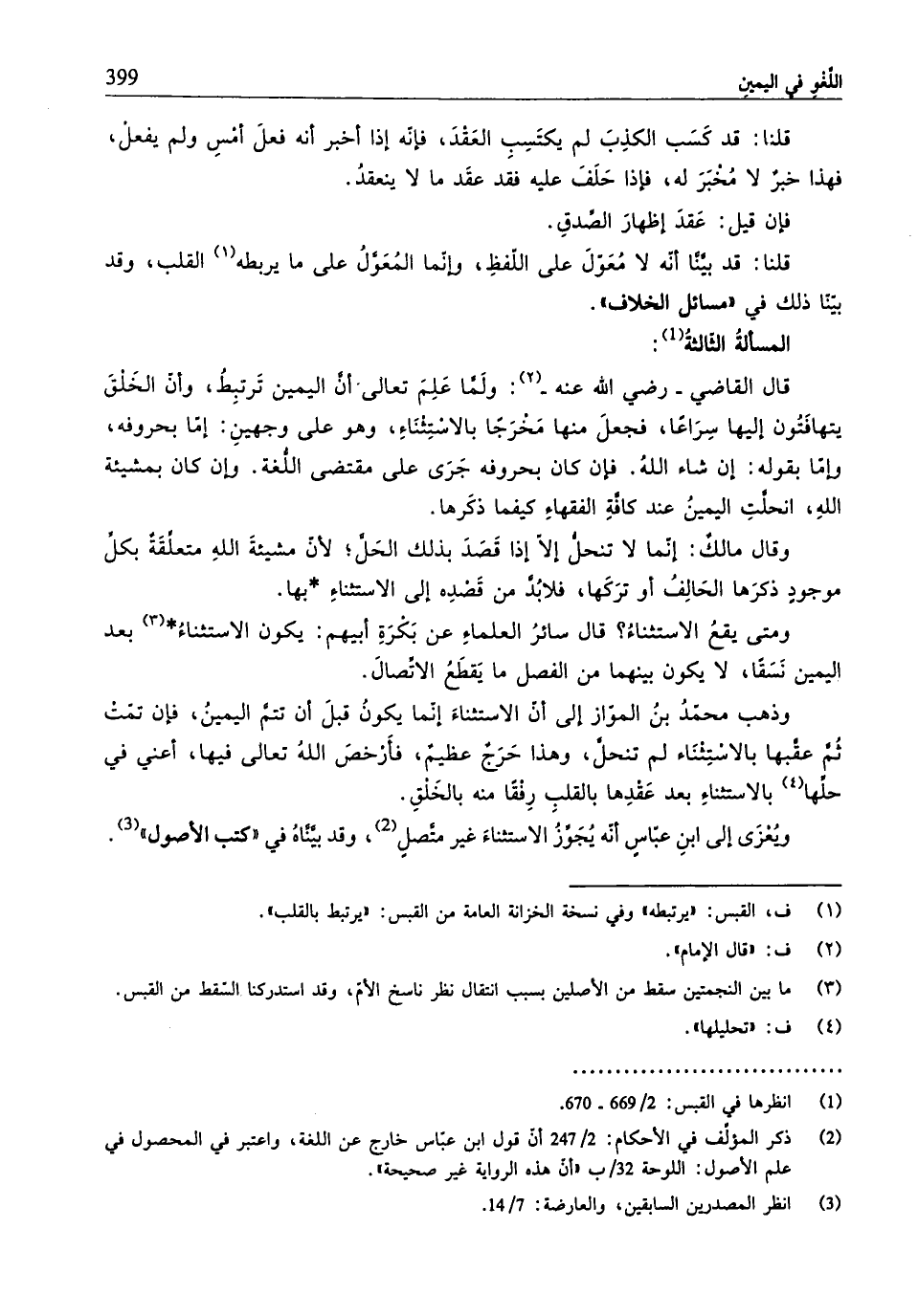 قال القاضي - رضي الله عنه -: ولَمَّا عَلِمَ تعالى أنَّ اليمين تَرتبِطُ، وأنّ الخَلْقَ يتهافَتُون إليها سِرَاعًا، فجعلَ منها مَخرَجًا بالاسْتِثنَاءِ، وهو على وجهينِ: إمّا بحروفه، وإمّا بقوله: إن شاء اللهُ. فإن كان بحروفه جَرَى على مقتضى اللُّغة. وإن كان بمشيئة اللهِ، انحلَّتِ اليمينُ عند كافَّةِ الفقهاءِ في كيفما ذكَرها.