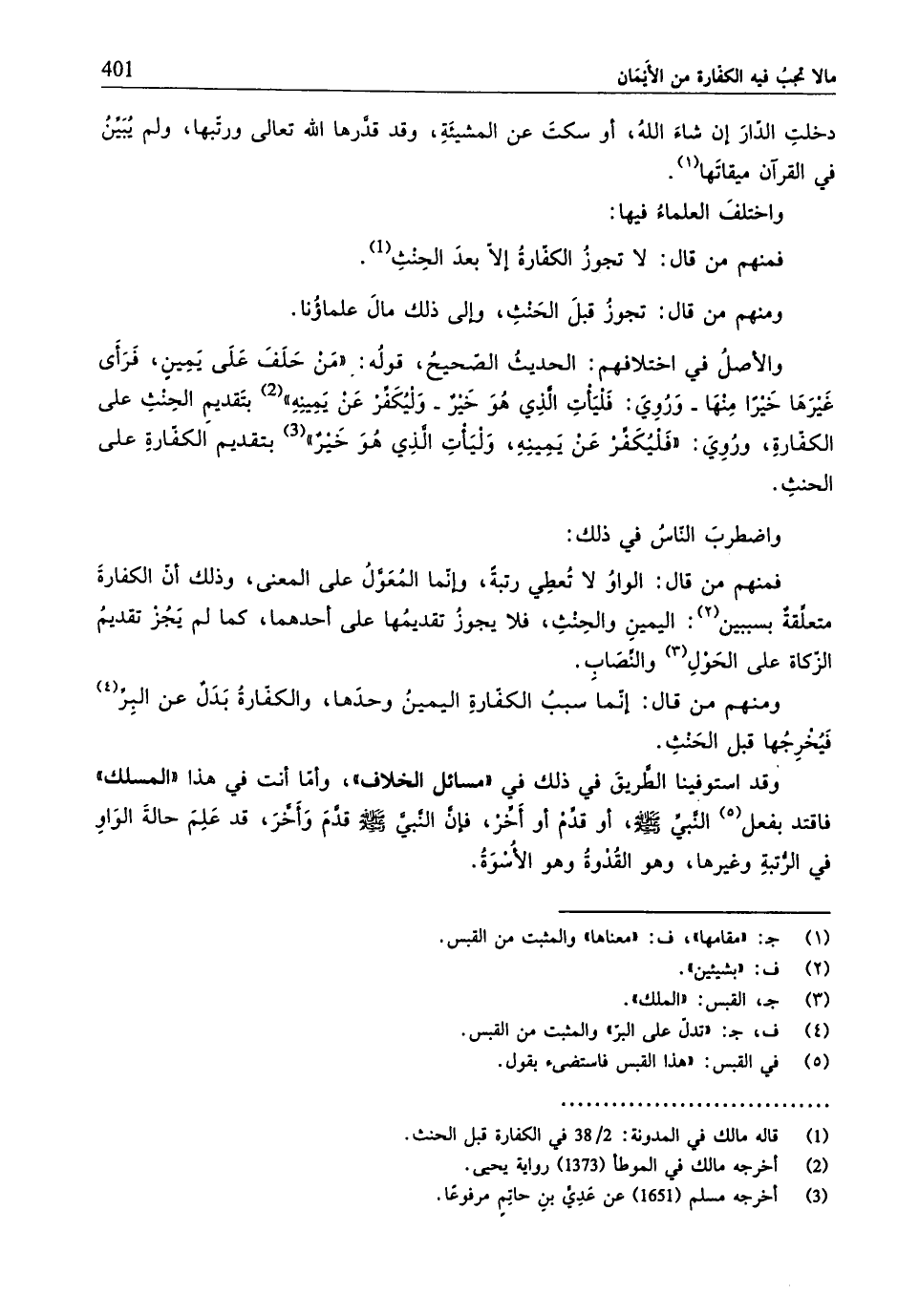 (¬1) قاله مالك في المدوّنة: 2/ 38 في الكفارة قبل الحنث.