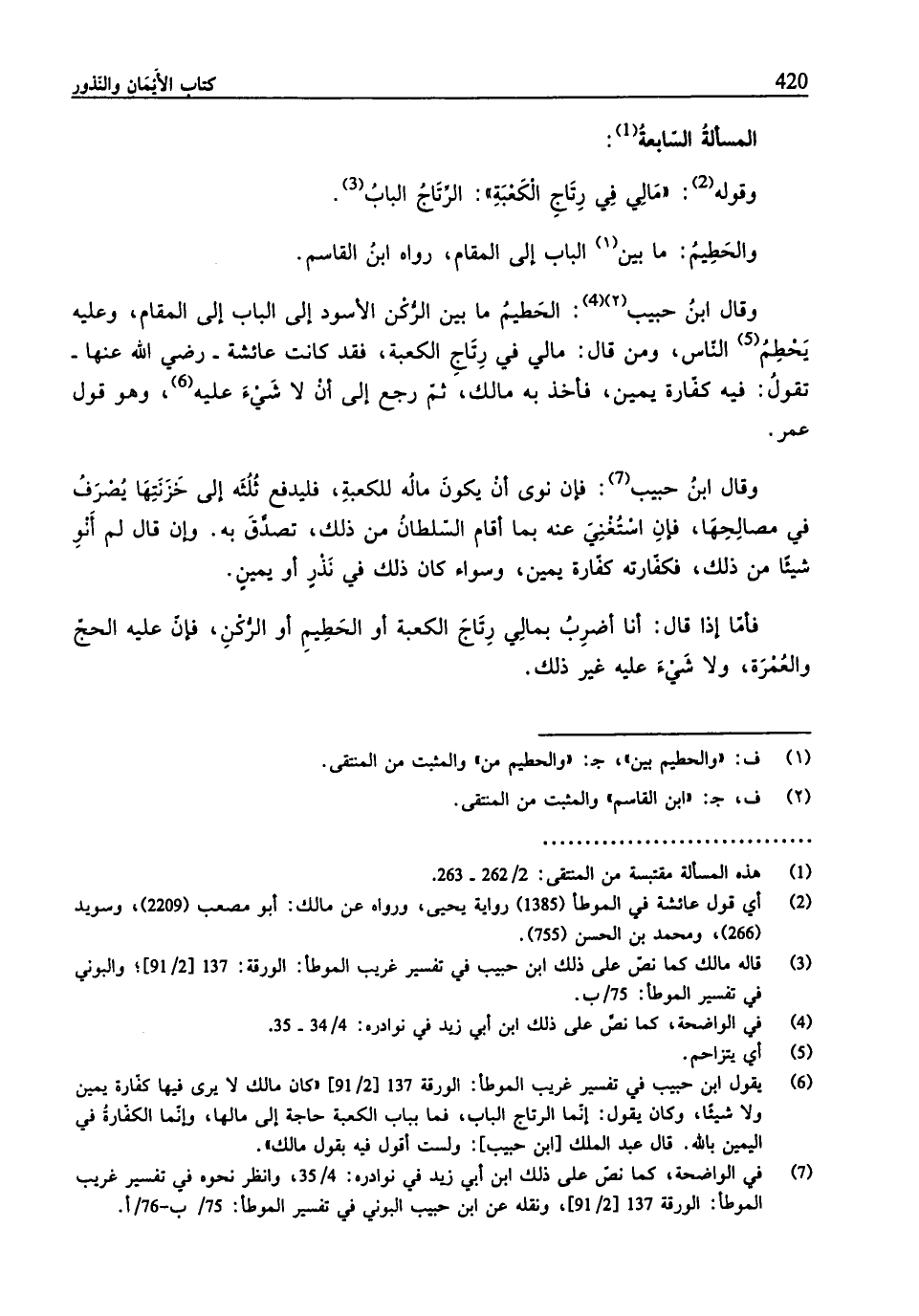 (¬6) يقول ابن حبيب في تفسير غريب الموطَّأ: الورقة 137 [2/ 91]، "كان مالك لا يرى فيها كفّارة يمين ولا شيئًا، وكان يقول: إنّما الرتاج الباب، فما بباب الكعبة حاجة إلى مالها، وإنّما الكفّارةُ في اليمين بالله. قال عبد الملك [ابن حبيب]: ولست أقول فيه بقول مالك".