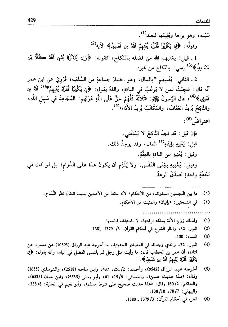 (¬4) النور: 32، والذي وجدناه في المصادر الحديثية، ما أخرجه عبد الرزّاق (10393) عن معمر، عن قتادة؛ أنّ عمر بن الخطّاب قال: ما رأيت مثل رجل لم يلتمس الفضل في الباه، والله يقول: {إِنْ يَكُونُوا فُقَرَاءَ يُغْنِهِمُ اللَّهُ مِنْ فَضْلِهِ}.