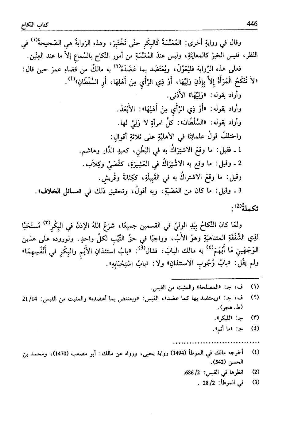 فعلى هذه الرِّواية فليُعَوَّلْ، ويُعْتضَد بما عَضَدَهُ به مالكٌ من قضاءِ عمرَ حين قال: "لَا تُنكَحُ الْمَرْأَةُ إِلَّا بِإذنْ وَلِيِّهَا، أَو ذِي الرَّأيِ من أَهْلِهَا، أوِ السُّلْطَان" (¬1).
