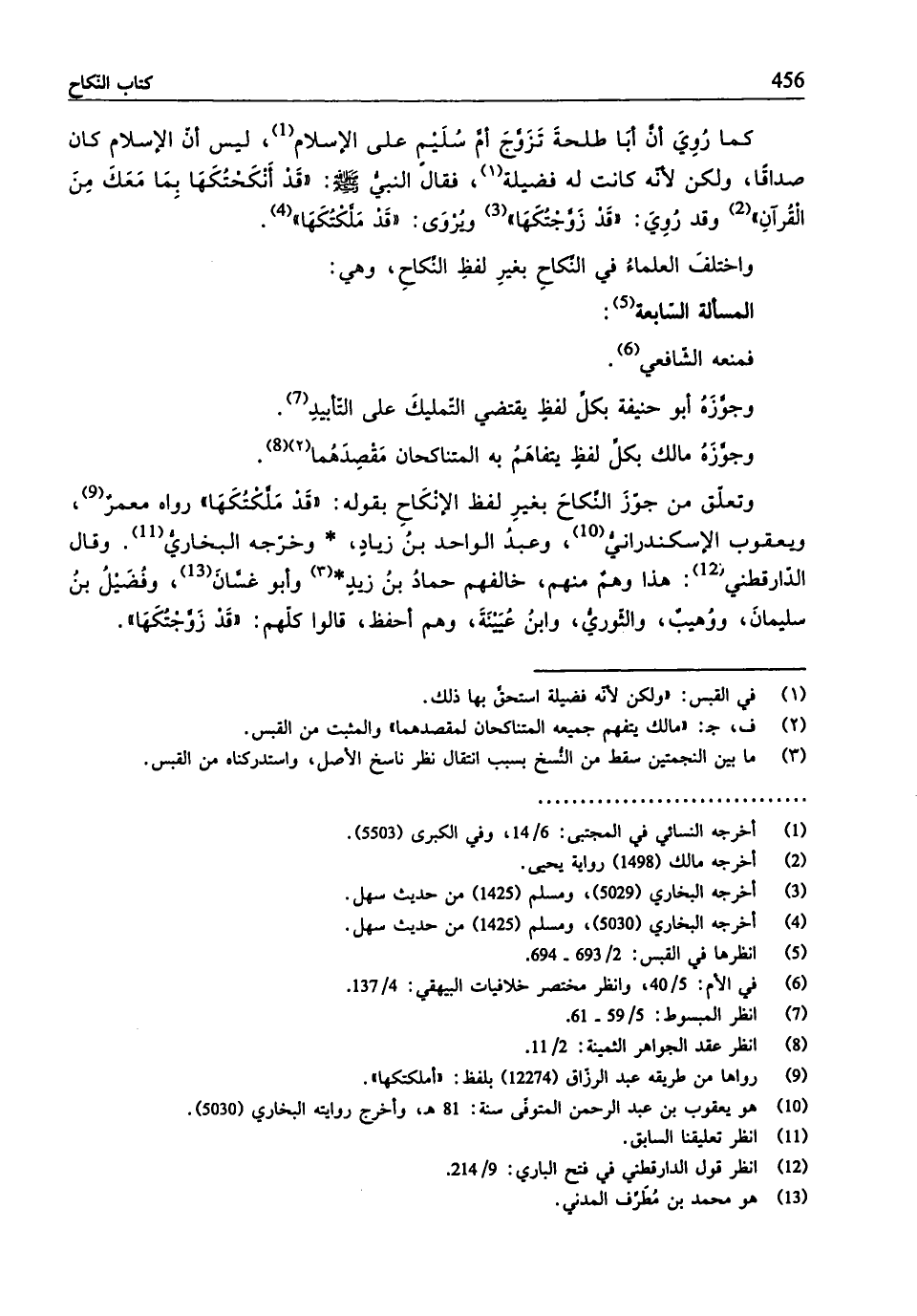 وتعلّق من جوّزَ النّكاحَ بغيرِ لفظ الإنْكَاحِ بقوله: "قَدْ مَلَّكتُكَهَا" رواه معمرٌ (¬9)، ويعقوب اإسكندرانيُّ (¬10)، وعبدُ الواحد بنُ زيادٍ،* وخرّجه البخاريُّ (¬11). وقال الدّارقطني (¬12): هذا وهمٌ منهم، خالفهم حمادُ بنُ زيدٍ* وأبو غسَّانَ (¬13)، وفُضَيلُ بنُ سليمانَ، ووُهيبٌ، والثّوريُّ، وابنُ عُيَيِنَةَ، وهم أحفظ، قالوا كلّهم: "قَدْ زَوَّجتُكَهَا".
