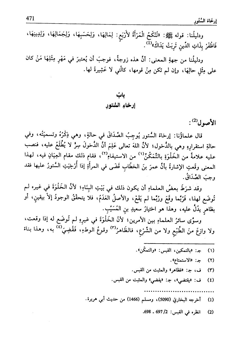 قال علماؤُنا: إرخاءُ السُّتور يُوجِبُ الصَّدَاقَ في حالةٍ، وهي ذِكرُهُ وتسميَتُه، وفي حالةِ استقرارِهِ وهي بالدُّخول؛ لأنَّ اللهَ تعالى عَلِمَ أنَّ الدُّخولَ سِرٌّ لا يُطَّلَعُ عليه، فنصب عليه علامةٌ من الخَلْوَةِ بالتَّمَكُنَّ من الاستيفاءِ، فقام ذلك مقام العِيَانِ فيه، لهذا المعنى وقَعتِ الإشارةُ بأنَّ عمرَ بنَ الخطابِ قَضَى في المرأَةِ إذا أُرْخِيَتِ السُّتورُ عليها فقد وجبَ الصَّدَاقُ.
