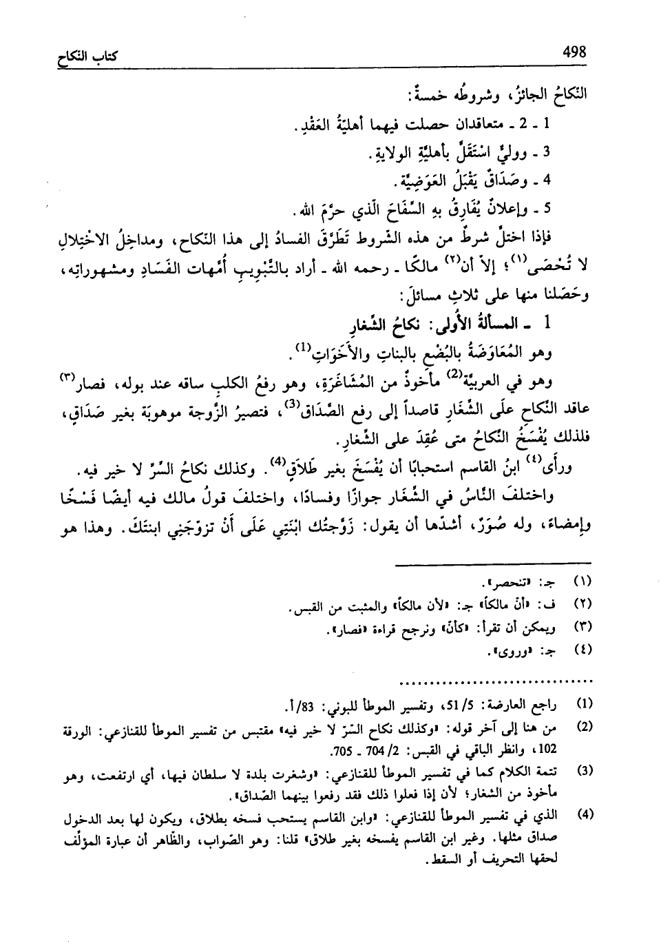 (¬4) الّذي في تفسير الموطَّأ للقنازعي: "وابن القاسم يستحب فسخه بطلاق، ويكون لها بعد الدخول صداق مثلها. وغير ابن القاسم يفسخه بغير طلاق" قلنا: وهو الصواب، والطاهر أنّ عبارة المؤلِّف لحقها التحريف أو السقط.