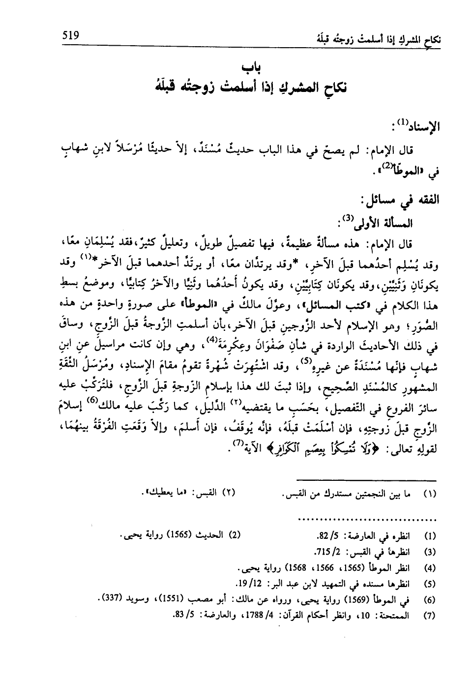 قال الإمام: هذه مسألةٌ عظيمةٌ، فيها تفصيلٌ طويلٌ، وتعليلٌ كثيرٌ، فقد يُسلِمَانِ معًا، وقد يُسْلِم أحدُهما قبلَ الآخرِ،* وقد يرتدَّان معًا، أو يرتَدَّ أحدهما قبلَ الآخر* وقد يكونَانِ وَثَنَّيْينِ، وقد يكونَان كِتَابِيَّيْنِ، وقد يكونُ أَحدُهُما وثَنِيًّا والآخرُ كِتابيًّا، وموضعُ بسطِ هذا الكلام في "كتب المسائل"، وعوَّلَ مالكٌ في "الموطَّأ" على صورةٍ واحدةٍ من هذه الصُّوَرِ؛ وهو الإسلام لأحد الزَّوجينِ قبلَ الآخر، بأن أسلمتِ الزَّوجةُ قبلَ الزَّوجِ، وساقَ في ذلك الأحاديثَ الواردة في شأنِ صَفْوَانَ وعِكْرمَةَ (¬4)، وهي وإن كانت مراسيلَ عنِ ابن شهابٍ فإنّها مُسْنَدَةٌ عن غيرِهِ (¬5)، وقد اشتُهِرَتْ شُهْرةً تقومُ مقامَ الإِسنادِ، ومُرْسَلُ الثَّقَةِ المشهورِ كّالمُسْنَدِ الصَّحيحِ، وإذا ثبتَ لك هذا بإسلامِ الزّوجةِ قبلَ الزَّوجِ، فلتُرَكَّبْ عليه سائرَ الفروعِ في التّفصيل، بحَسَبِ ما يقتضيه الدَّليلَ، كما رَكَّبَ عليه مالك (¬6) إسلامَ الزوجِ قبلَ زوجتِهِ، فإن أسلَمَت قبلَهُ، فإنَّه يُوقَفُ، فإن أَسلمَ، وإلا وَقَعَتِ الفُرْقَةُ بينهُمَا، لقولِهِ تعالى: {وَلَا تُمْسِكُوا بِعِصَمِ الْكَوَافِرِ} الآية (¬7).