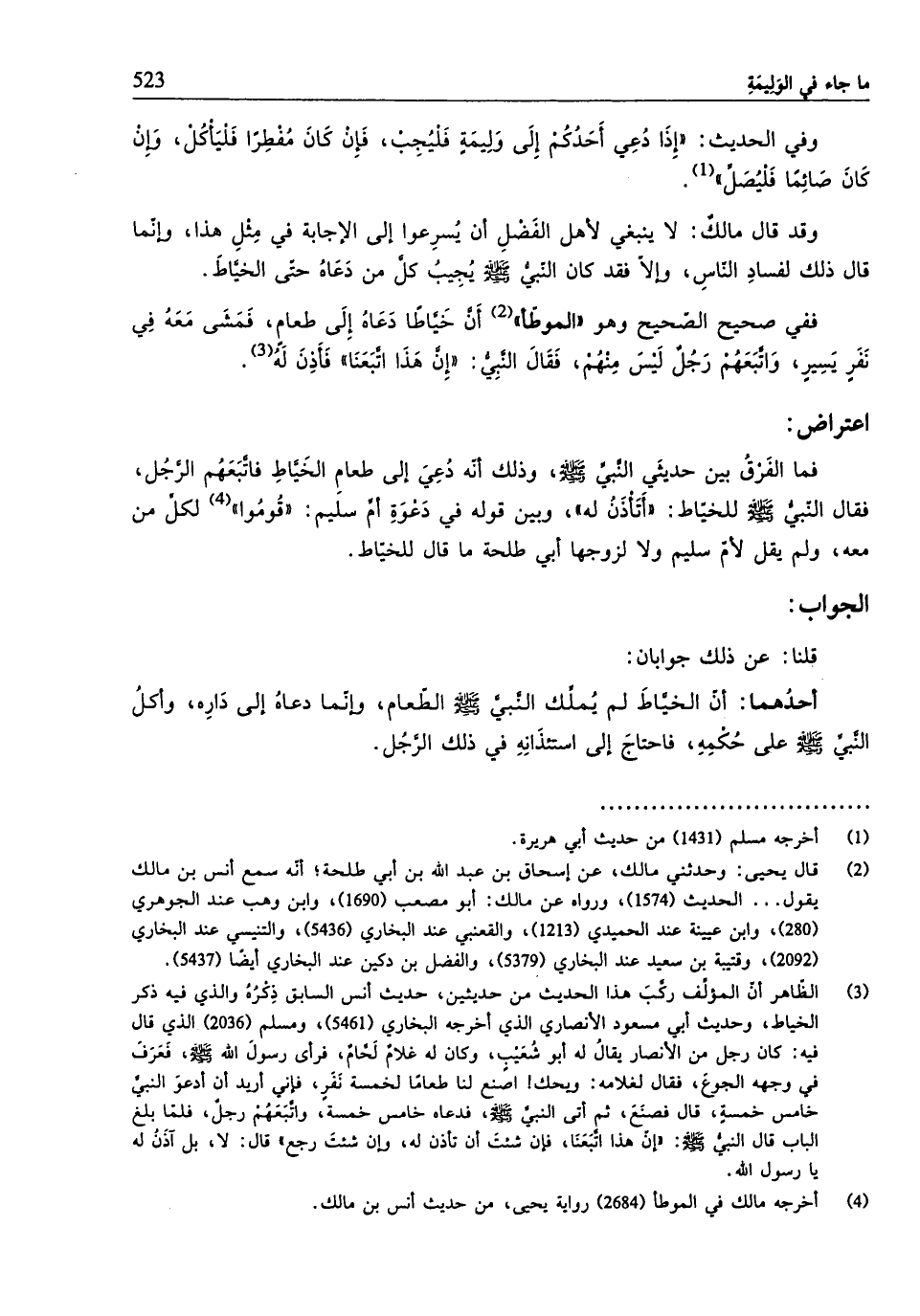 ففي صحيح الصّحيح وهو "الموطَّأ" (¬2) أَن خَيَّاطًا دَعَاهُ إلَى طعام، فَمَشَى مَعَهُ في نَفَرٍ يَسِيرٍ، وَاتَّبَعَهُمْ رَجُلٌ لَيس مِنْهُمْ، فَقَالَ النّبيُّ: "إِنَّ هَذَا اتَّبَعَنَا" فّأَذَنَ لَهُ (¬3).