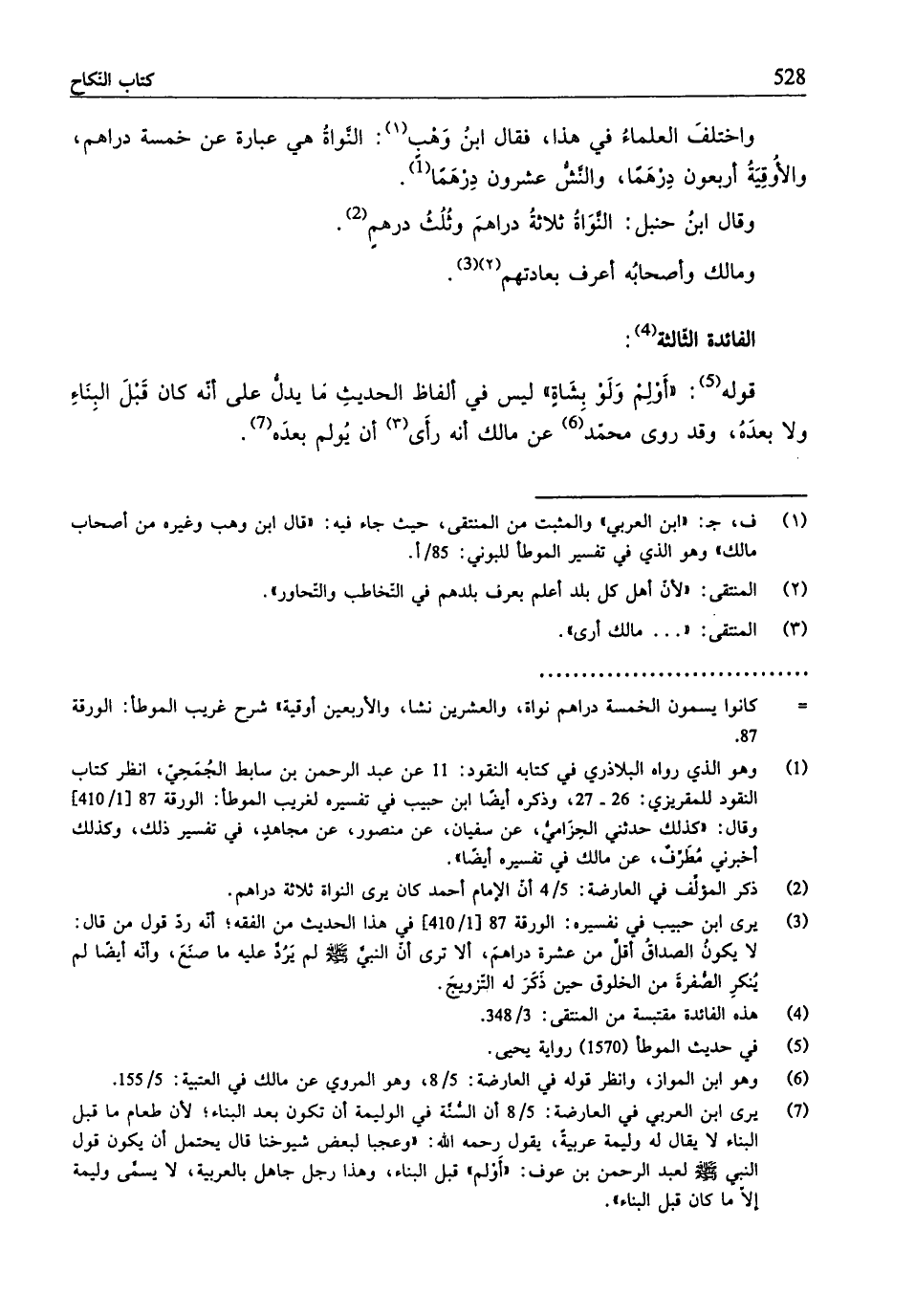 (¬7) يرى ابن العربي في العارضة: 5/ 8 أنّ السُّنَّة في الوليمة أنّ تكون بعد البناء؛ لأنّ طعام ما قبل البناء لا يقال له وليمة عربيةً، يقول رحمه الله: "وعجبا لبعض شيوخنا قال يحتمل أنّ يكون قول النّبيّ - صلّى الله عليه وسلم - لعبد الرّحمن بن عوف: "أَوْلم" قبل البناء، وهذا رجل جاهل بالعربية، لا يسمَّى وليمة إِلَّا ما كان قبل البناء".