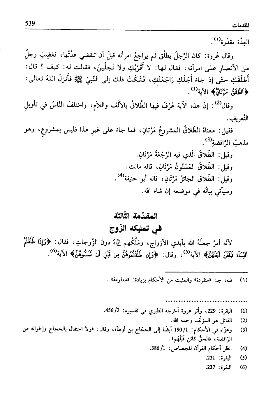 وقال (¬2): إنَّ هذه الآية عُرَّفَ فيها الطَّلاقُ بالأَلف واللّام، واختلفَ النّاسُ في تأويلِ التَّعريفِ.