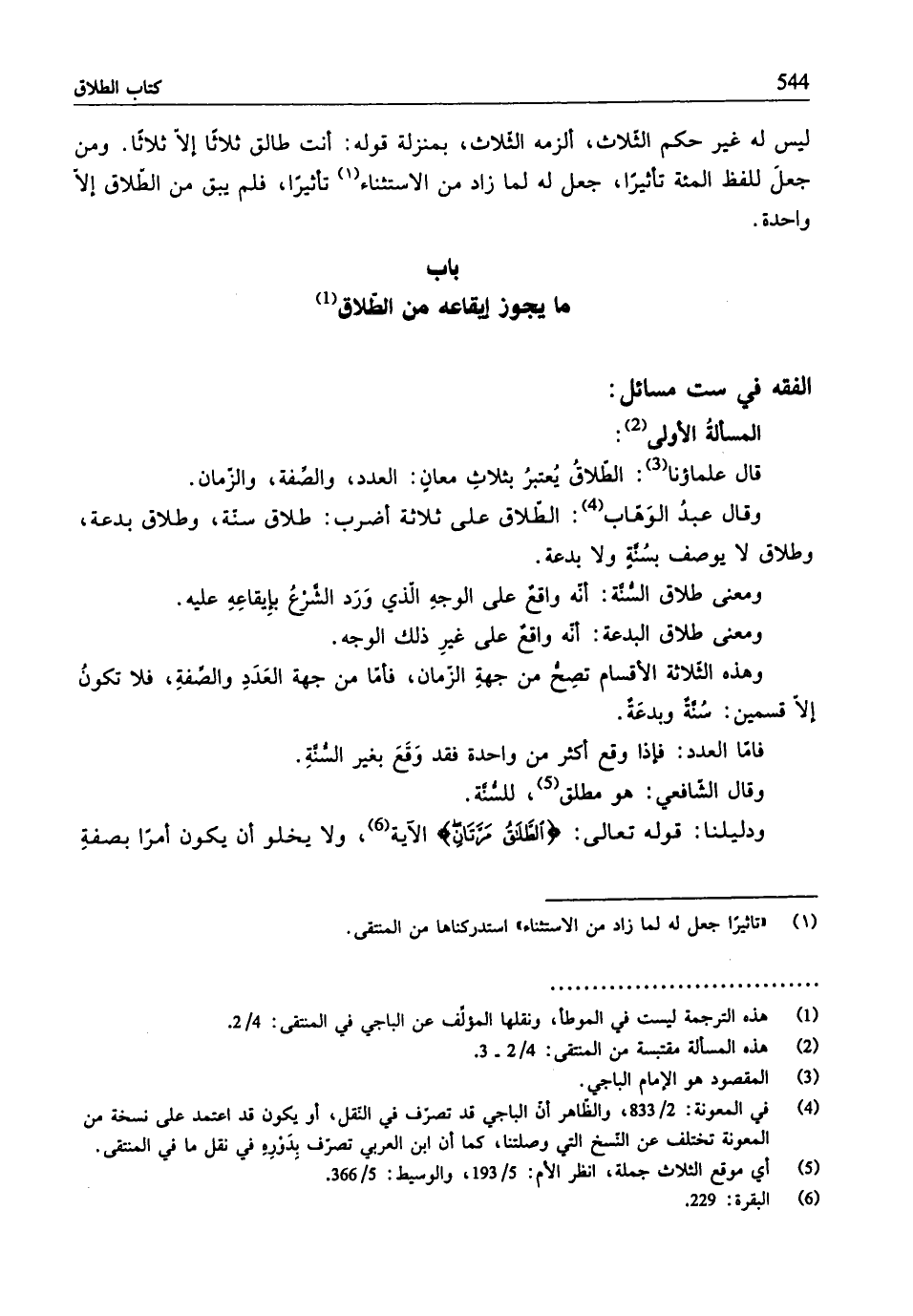 (¬4) في المعونة: 2/ 833، والظّاهر أنّ الباجي قد تصرّف في النّقل، أو يكون قد اعتمد على نسخة من المعونة تختلف عن النّسخ الّتي وصلتنا، كما أنّ ابن العربي تصرّف بدورِهِ في نقل ما في المنتقى.