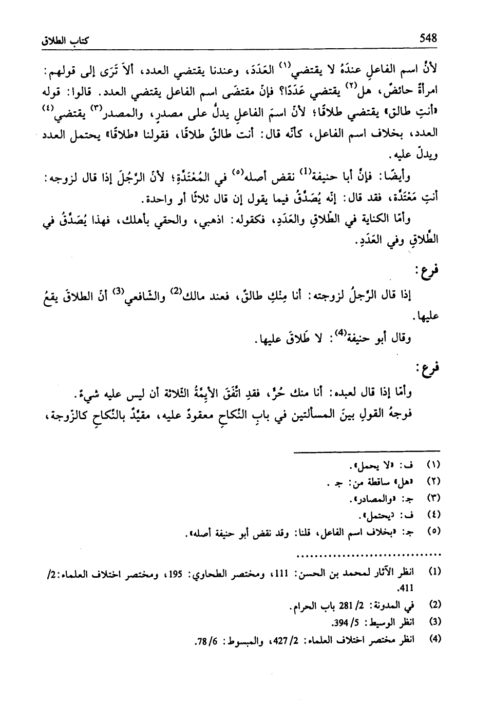 لأنَّ اسم الفاعلِ عندَهُ لا يقتضي العَددَ، وعندنا يقتضي العدد، ألَا تَرَى إلى قولهم: امرأةً حائضٌ، هل يقتضي عَدَدًا؟ فإنّ مقتضَى اسم الفاعل يقتضي العدد. قالوا: قوله "أنتِ طالق" يقتضي طلاقًا؛ لأنّ اسمَ الفاعلِ يدلُّ على مصدرٍ، والمصدر يقتضي العدد، بخلاف اسم الفاعل، كأنّه قال: أنت طالقٌ طلاقًا، فقولنا "طلاقًا" يحتمل العدد ويدلُّ عليه.