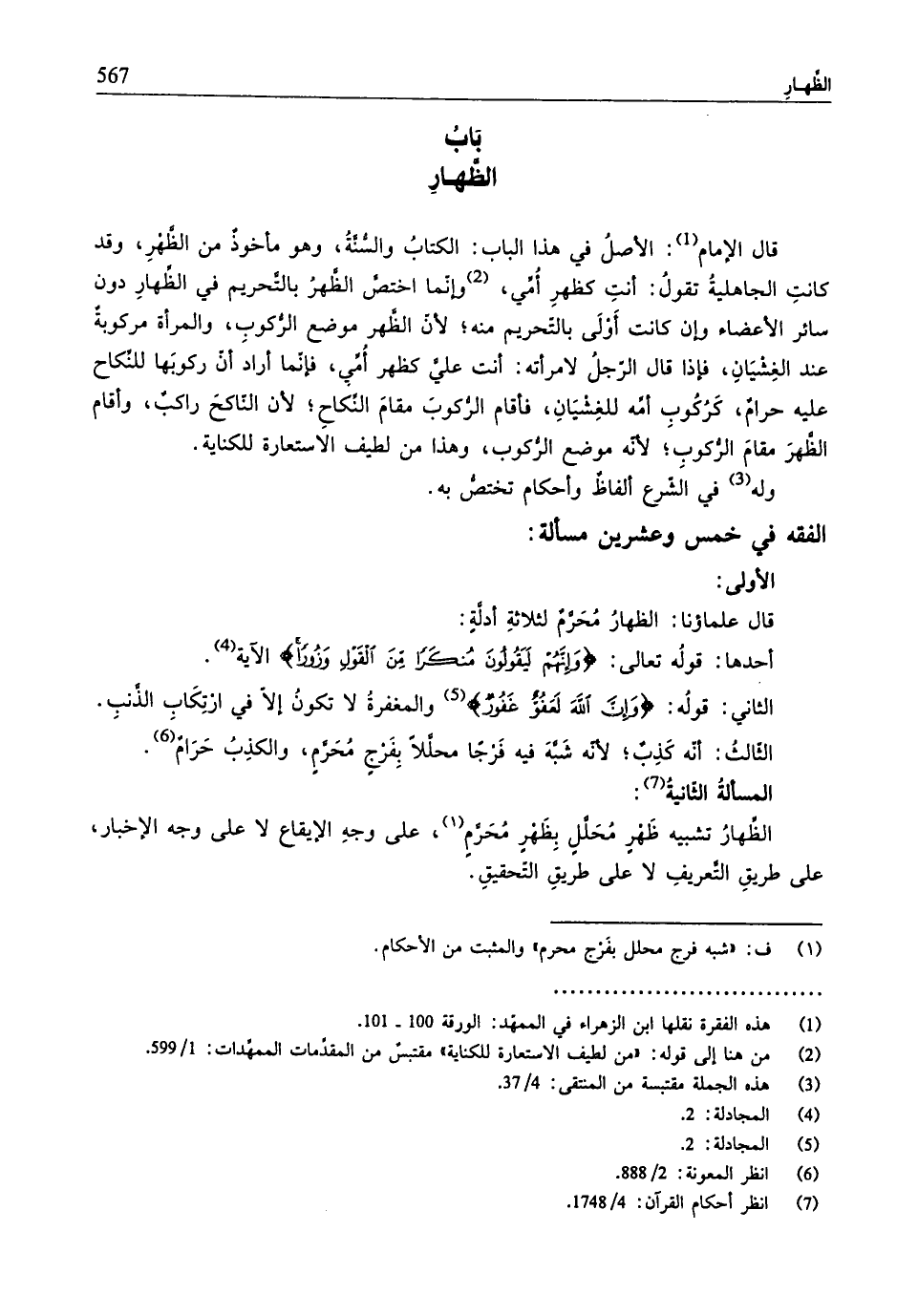 قال الإمام (¬1): الأصلُ في هذا الباب: الكتابُ والسُّنَّةُ، وهو مأخوذٌ من الظَّهْرِ، وقد كانتِ الجاهليةُ تقولُ: أنتِ كظهرِ أُمِّي، (¬2) وإنّما اختصَّ الظَّهرُ بالتَّحريم في الظِّهارِ دون سائر الأعضاء وإن كانت أَوْلَى بالتّحريم منه؛ لأنّ الظَّهر موضع الرُّكوب، والمرأة مركوبةٌ عند الغِشيَانِ، فإذا قال الرّجلُ لامرأته: أنت عليَّ كظهر أُمِّي، فإّنما أرادَ أنّ ركوبَها للنِّكاح عليه حرامٌ، كَرُكُوب أمِّه للغِشيَانِ، فأقام الرُّكوبَ مقامَ النِّكاحِ؛ لأنّ النّاكحَ راكبٌ، وأقام الظَّهرَ مقامَ الرُّكوبِ؛ لأنّه موضع الرُّكوب، وهذا من لطيف الاستعارة للكناية.