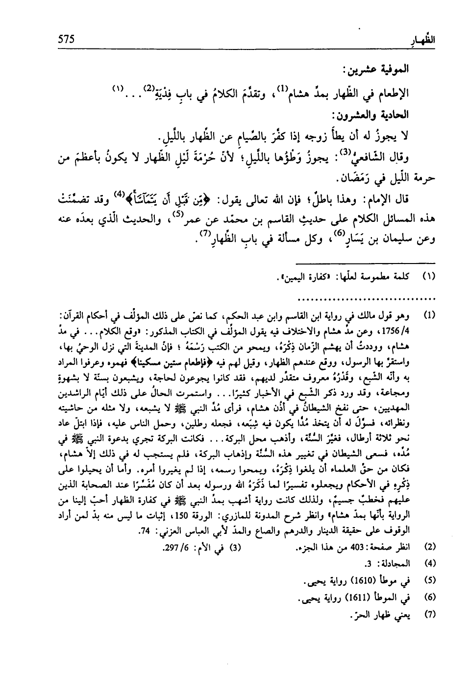(¬1) وهو قول مالك في رواية ابن القاسم وابن عبد الحكم، كما نصّ على ذلك المؤلّف في أحكام القرآن: 4/ 1736، وعن مدّ هشام والاختلاف فيه يقول المؤلِّف في الكتاب المذكور: "وقع الكلام ... في مدَّ هشام، ووددتُ أنّ يهشم الزّمان ذِكْرَهُ، ويمحو من الكتب رَسْمَهُ؛ فإنّ المدينةَ الّتي نزل الوحيُ بها، واستقرَّ بها الرسول، ووقع عندهم الظهار، وقيل لهم فيه {فَإِطْعَامُ سِتِّينَ مِسْكِينًا} فهموه وعرفوا المراد به وأنّه الشّبع، وقدْرُه معروف متقدَّر لديهم، فقد كانوا يجوعون لحاجة، ويشبعون بسنّة لا بشهوةٍ ومجاعة، وقد ورد ذكر الشّبع في الأخبار كثيرًا ... واستمرت الحالُ على ذلك أيّام الراشدين المهديين، حتّى نفخ الشيطانُ في أذُن هشام، فرأى مُدَّ النّبيّ - صلّى الله عليه وسلم - لا يشبعه، ولا مثله من حاشيته ونظرائه، فسوَّلَ له أنّ يتخذ مُدًّا يكون فيه شِبعه، فجعله رطلين، وحمل النَّاس عليه، فهذا ابتلّ عاد نحو ثلاثة أرطال، فغيَّر السُّنَّة، وأذهب محل البركة ... فكانت البركة تجري بدعوة النّبيّ - صلّى الله عليه وسلم - في مُدَّه، فسعى الشيطان في تغيير هذه السُّنَّة وإذهاب البركة، فلم يستجب له في ذلك إِلَّا هشام، فكان من حقِّ العلماء أنّ يلغوا ذِكرَهُ، ويمحوا رسمه، إذا لم يغيروا أمره. وأمّا أنّ يحيلوا على في ذِكرِهِ في الأحكام ويجعلوه تفسيرًا لما ذَكرَهُ الله ورسوله بعد أنّ كان مُفسَّرًا عند الصّحابة الذين عليهم فخطبٌ جسيمٌ، ولذلك كانت رواية أشهب بمدَّ النّبيّ - صلّى الله عليه وسلم - في كفارة الظهار أحبّ إلينا من الرِّواية بأنّها بمدّ هشام" وانظر شرح المدوّنة للمازري: الورقة 150، إثبات ما ليس منه بدّ لمن أراد الوقوف على حقيقة الدينار والدرهم والصاع والمدّ لأبي العباس العزني: 74.