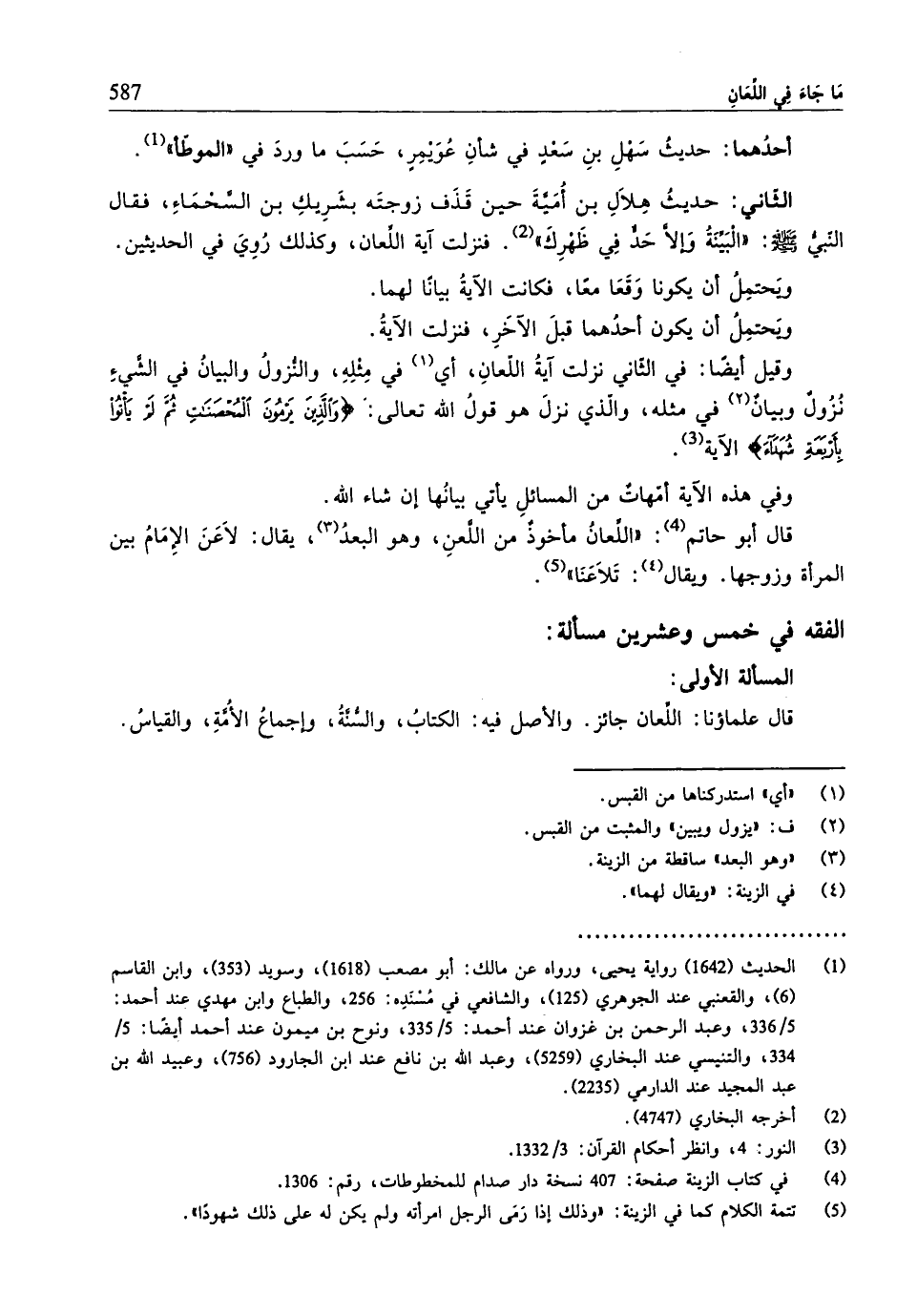 (¬5) تتمّة الكلام كما في الزينة: "وذلك إذا رَمَى الرَّجل امرأته ولم بكن له على ذلك شهودًا".