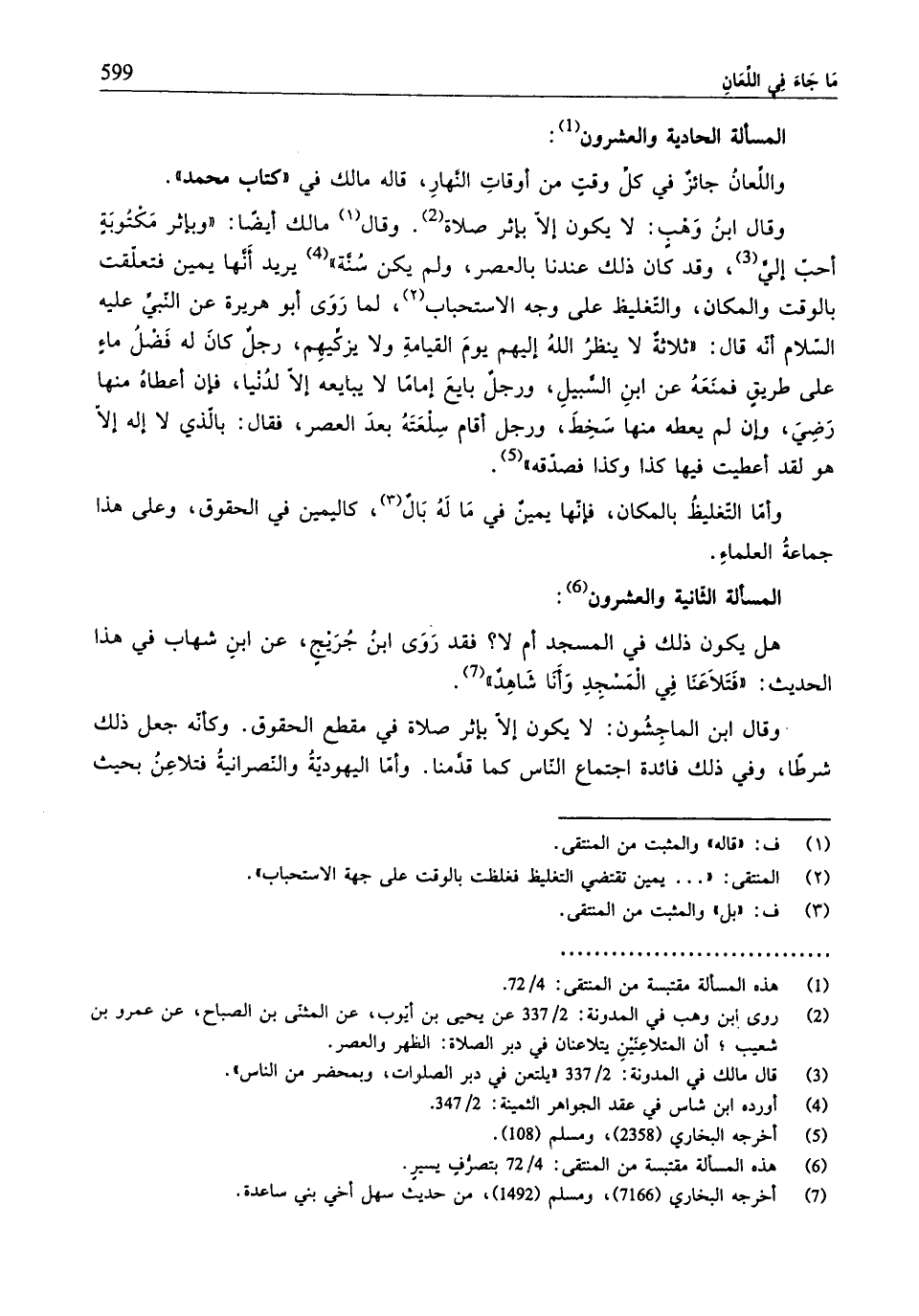(¬2) روى ابن وهب في المدوّنة: 2/ 337 عن يحيى بن أيّوب، عن المثنّى بن الصباح، عن عمرو بن شعيب؛ أنّ المتلاعِنَينِ يتلاعنان في دبر الصّلاة: الظهر والعصر.