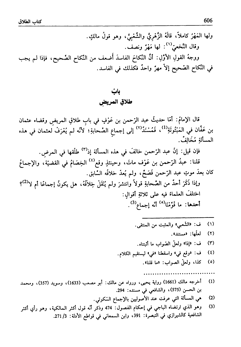 قال الإمامُ: أمّا حديثُ عبد الرّحمن بن عَوف في باب طلاقِ المريضِ وقضاء عثمان بن عَفَّان في المَبتُوتَةِ (¬1)، فَمُسْنَدٌ إلى إجماعِ الصَّحابةِ؛ لأنّه لم يُعْرَف لعثمان في هذه المسألةِ مُخَالِفٌ.