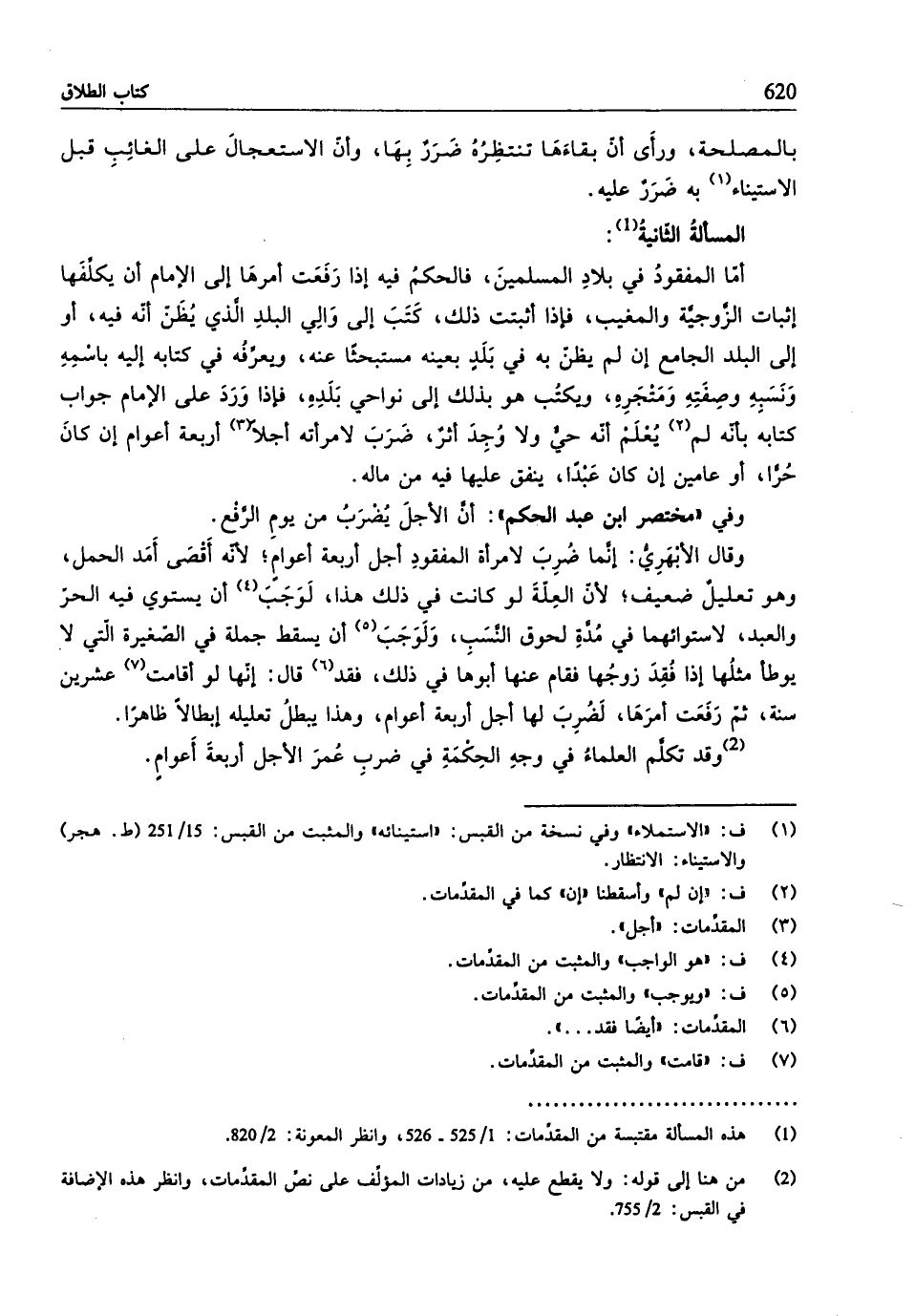 بالمصلحة، ورأَى أنّ بقاءَهَا تنتظِرُهُ ضَرَرٌ بِهَا، وأنّ الاْستعجالَ على الغائِبِ قبل الاستيناء به ضرَرٌ عليه.