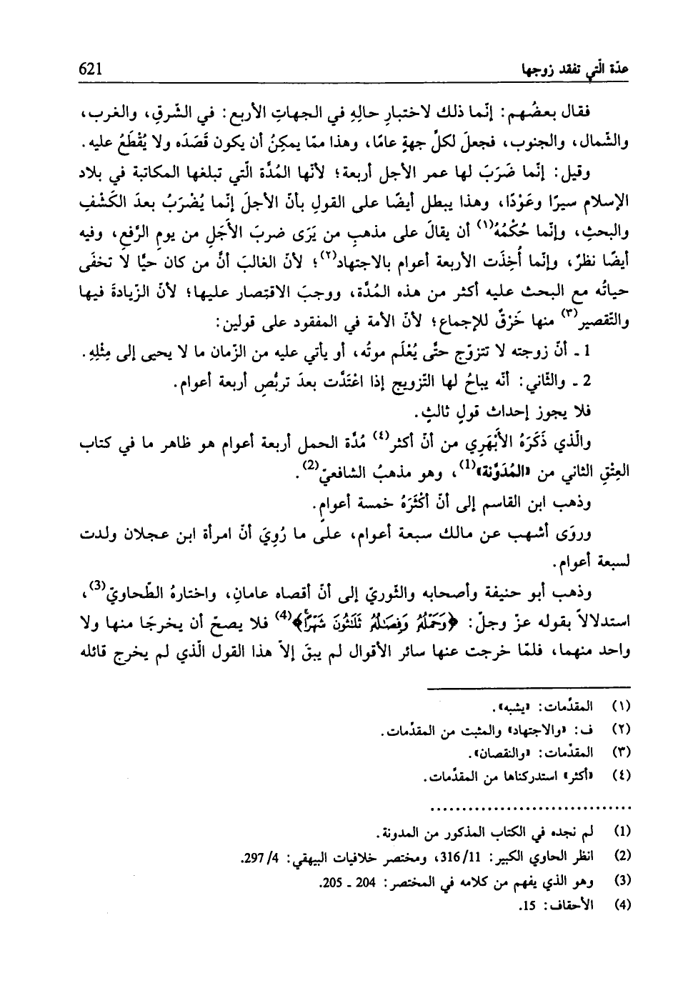 وقيل: إنّما ضَرَبَ لها عمر الأجل أربعة؛ لأنّها المُدَّة الّتي تبلغها المكاتبة في بلاد الإسلام سيرًا وعَودًا، وهذا يبطل أيضًا على القولِ بأنَّ الأجلَ إنَّما يُضرَبُ بعدَ الكَشْفِ والبحثِ، وإنّما حُكمُهُ أنّ يقالَ على مذهبِ من يَرَى ضربَ الأَجَلِ من يومِ الرَّفعِ، وفيه أيضًا نظرٌ، وإنّما أُخِذَت الأربعة أعوام بالاجتهاد؛ لأنّ الغالبَ أنَّ من كان حيًّا لا تخفَى حياتُه مع البحث عليه أكثر من هذه المُدَّة، ووجبَ الاقتصار عليها؛ لأنّ الزّيادةَ فيها والتّقصير منها خَرْقٌ للإجماع؛ لأنّ الأُمَّة في المفقود على قولين: