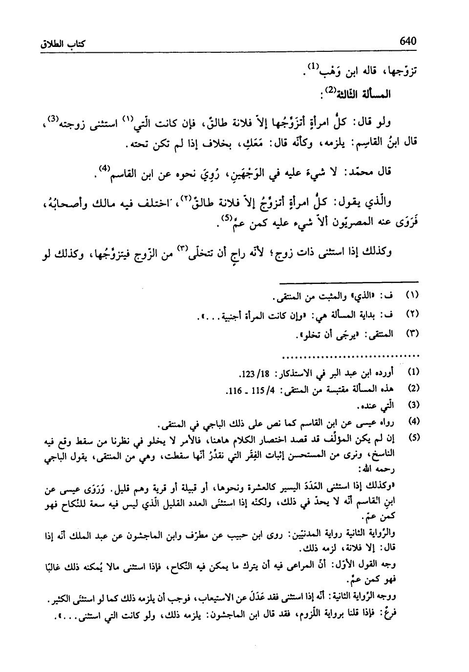 (¬5) إنَّ لم يكن المؤلِّف قد قصد اختصار الكلام هاهنا، فالأمر لا يخلو في نظرنا من سقط وقع فيه الناسخ، ونرى من المستحسن إثبات الفِقَر الّتي نقدِّرُ أنَّها سقطت، وهي من المنتقى، يقول الباجى رحمه الله:
