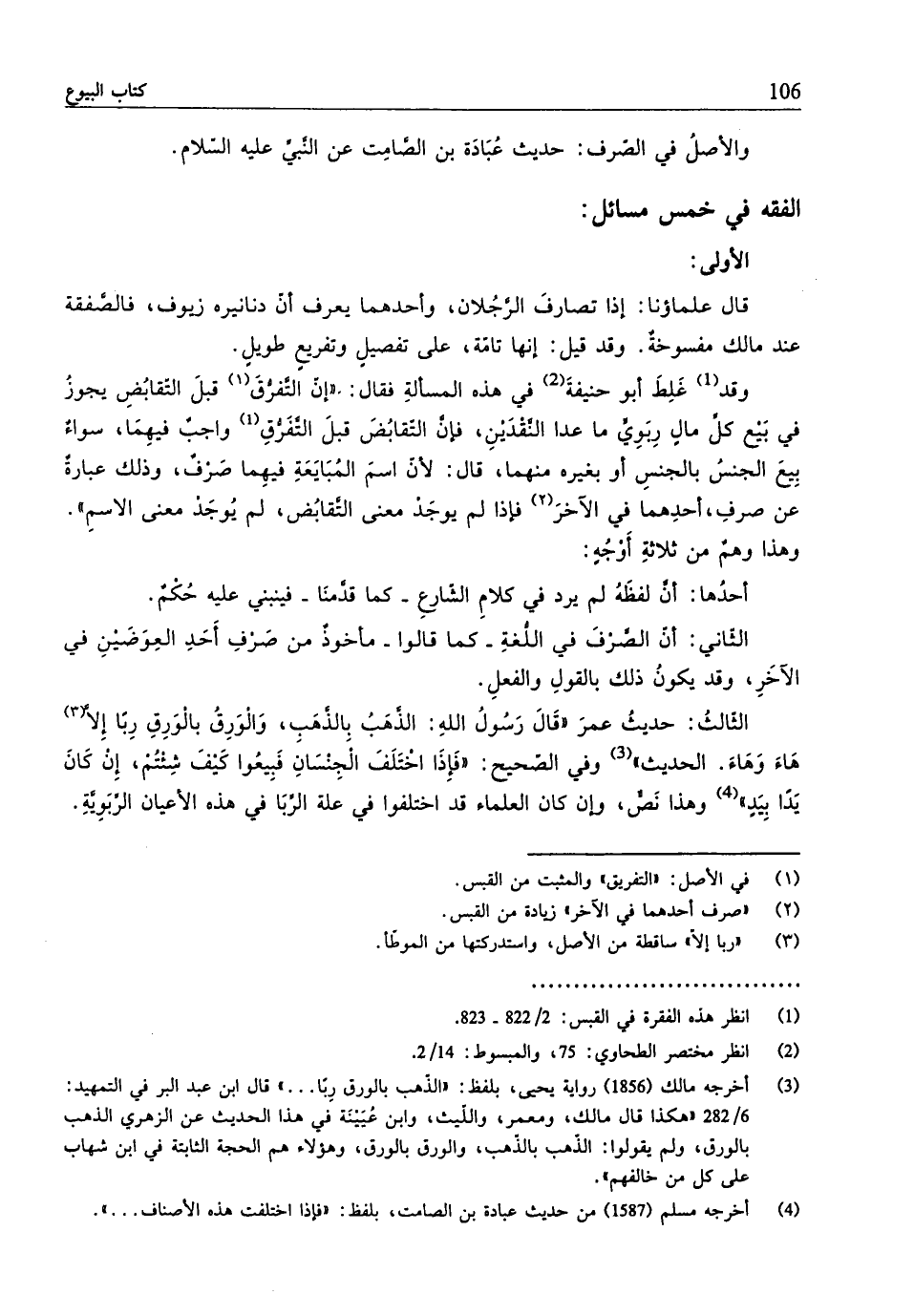 والأصلُ في الصّرف: حديث عُبَادَة بن الصَّامِت عن النَّبيِّ -عليه السّلام-.
