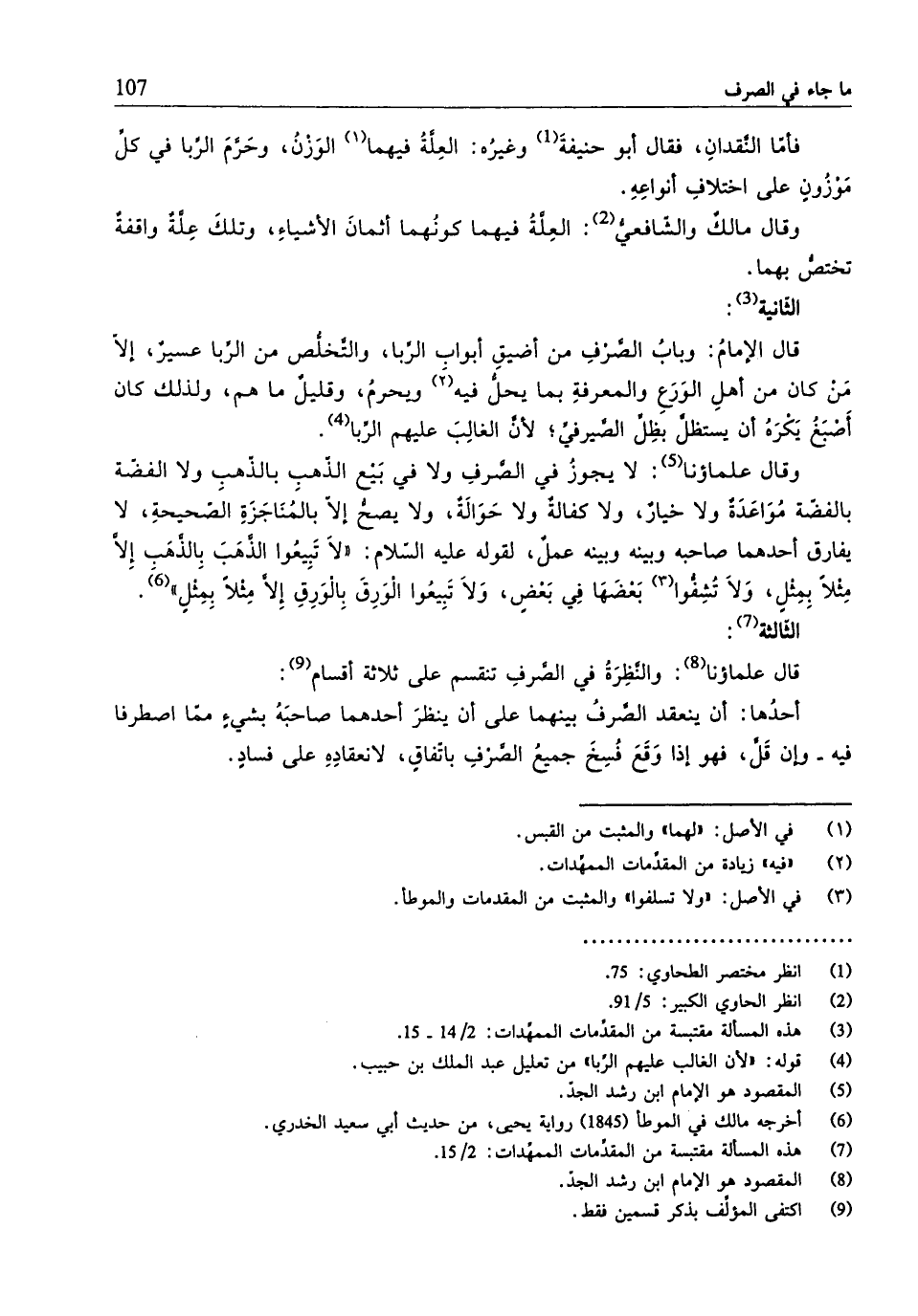قال الإمامُ: وبابُ الصَّرفِ من أضيقِ أبواب الرِّبا، والتَّخلُّص من الرِّبا عسيرٌ، إِلَّا مَنْ كان من أهلِ الوَرَعِ والمعرفةِ بما يحلُّ فيه ويحرمُ، وقليلٌ ما هم، ولذلك كان أَصبَغُ يَكرَهُ أنّ يستظلَّ بظِلِّ الصَّيرفىِّ؛ لأنَّ الغالِبَ عليهم الرِّبا (¬4).