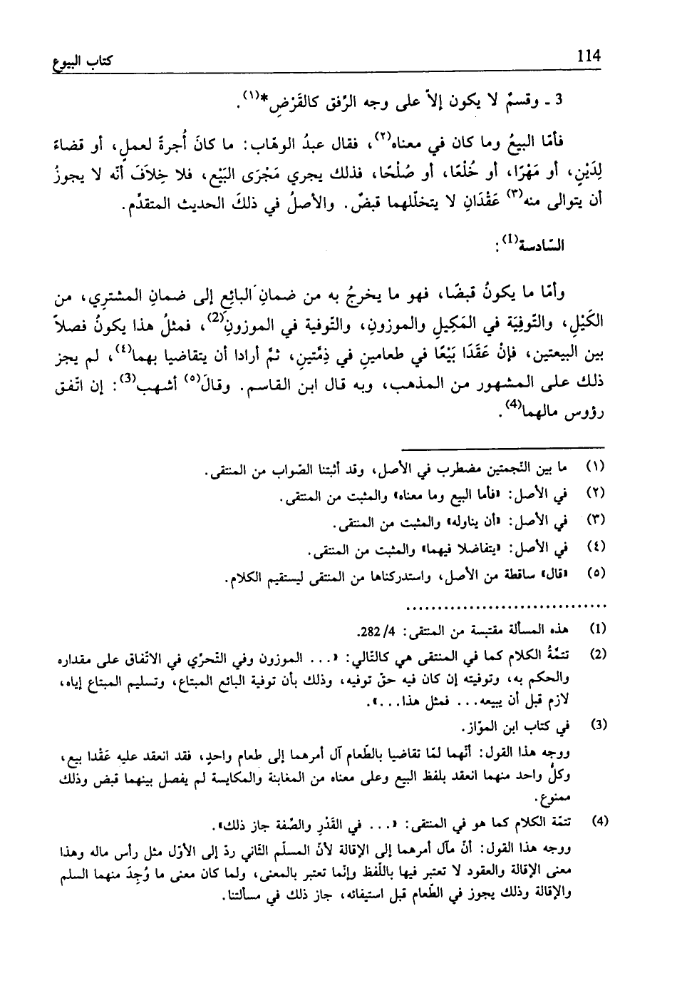 (¬2) تتمَّةُ الكلام كما في المنتقى هي كالتالي: " ... الموزون وفي التّحرِّي في الاتّفاق على مقداره والحكم به، وتوفيته إنَّ كان فيه حق توفيه، وذلك بأن توفية البائع المبتاع، وتسليم المبتاع إياه، لازم قبل أنّ يبيعه ... فمثل هذا ... ".