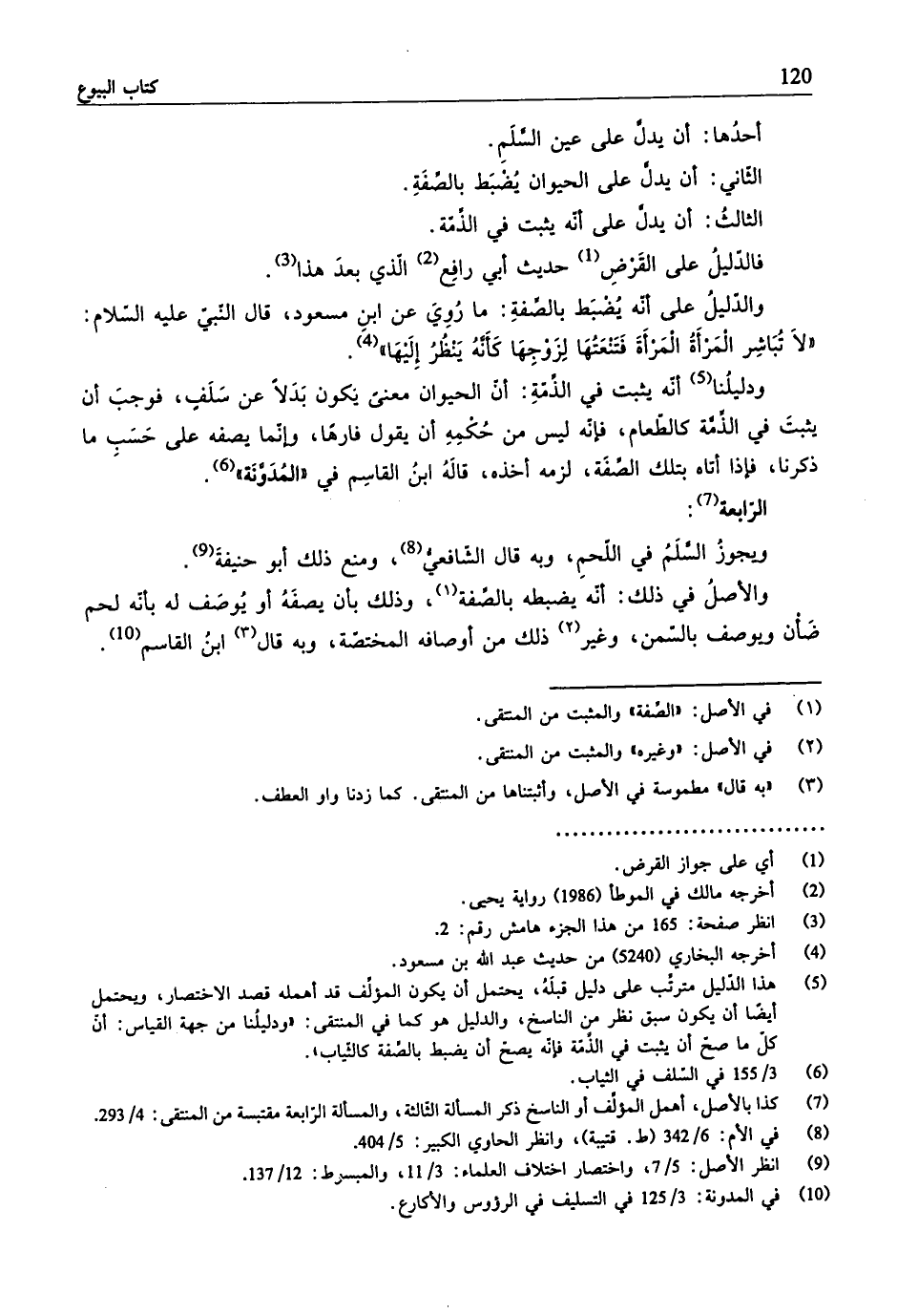 (¬5) هذا الدّليل مترتِّب على دليل قبلهُ، يحتمل أنّ يكون المؤلِّف قد أهمله قصد الاختصار، ويحتمل أيضًا أنّ يكون سبق نظر من الناسخ، والدّليل هو كما في المنتقى: "ودليلُنا من جهة القياس: أنّ كلّ ما صحّ أنّ يثبت في الذِّمة فإنّه يصحّ أنّ يضبط بالصِّفة كالثِّياب".