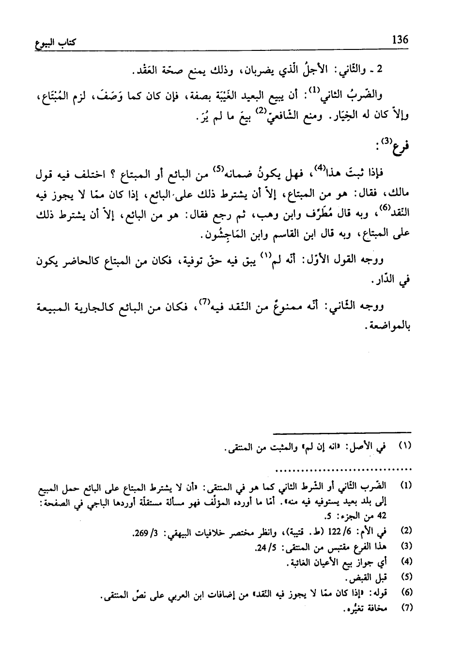 (¬1) الضّرب الثّاني أو الشّرط الثّاني كما هو في المنتقى: "أنّ لا يشترط المبتاع على البائع حمل المبيع إلى بلد بعيد يستوفيه فيه منه". أمّا ما أورده المؤلِّف فهو مسألة مستقلّة أوردها الباجي في الصفحة: 42 من الجزء: 5.