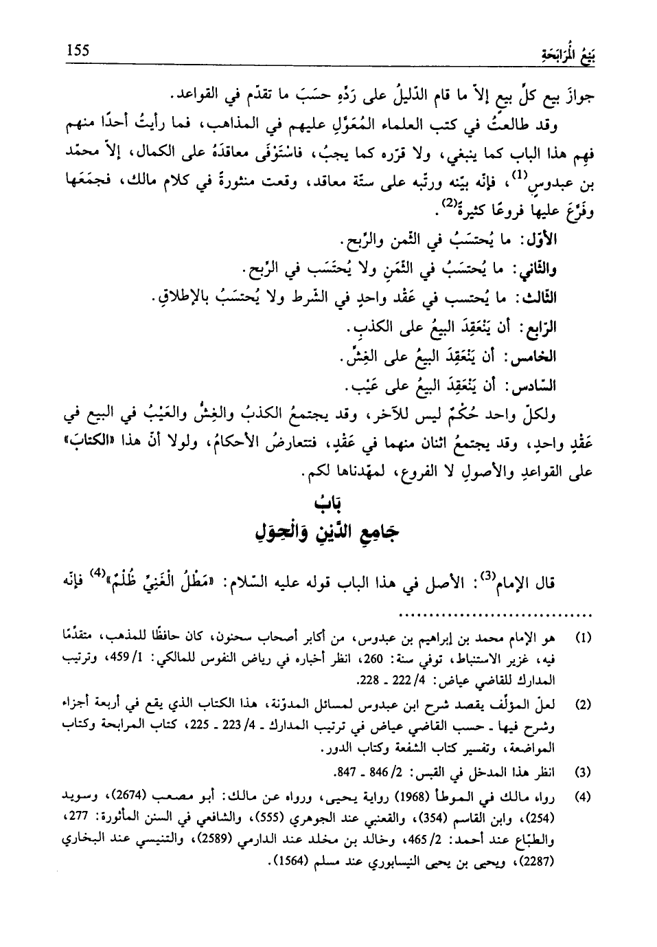 وقد طالعتُ في كتب العلماء المُعَوَّلِ عليهم في المذاهب، فما رأيتُ أحدًا منهم فهِم هذا الباب كما ينبغي، ولا قرّره كما يجبُ، فاسْتَوْفَى معاقدَهُ على الكمال، إِلَّا محمّد بن عبدوسٍ (¬1)، فإنّه بيّنه ورتّبة على ستّة معاقد، وقعت منثورةً في كلام مالك، فجمَعَها وفَرَّعَ عليها فروعًا كثيرةً (¬2).