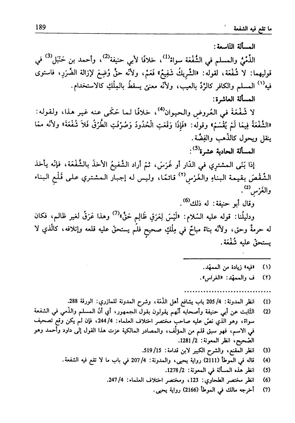 (¬2) الثّابت عن أبي حنيفة وأصحابه أنّهم يقولون بقول الجمهور، أي أنّ المسلم والذمي في الشُّفعَةِ سواء، وهو الّذي نصّ علبه صاحب مختصر اختلاف العلماء: 4/ 244، فإن لم يكن وقع تصحيف في الاسم، فهو سبق قلم من المؤلِّف، والمصادر المالكية عزت هذا القول إلى داود وأحمد وهو الصّحيح، انظر المعونة: 2/ 1281.