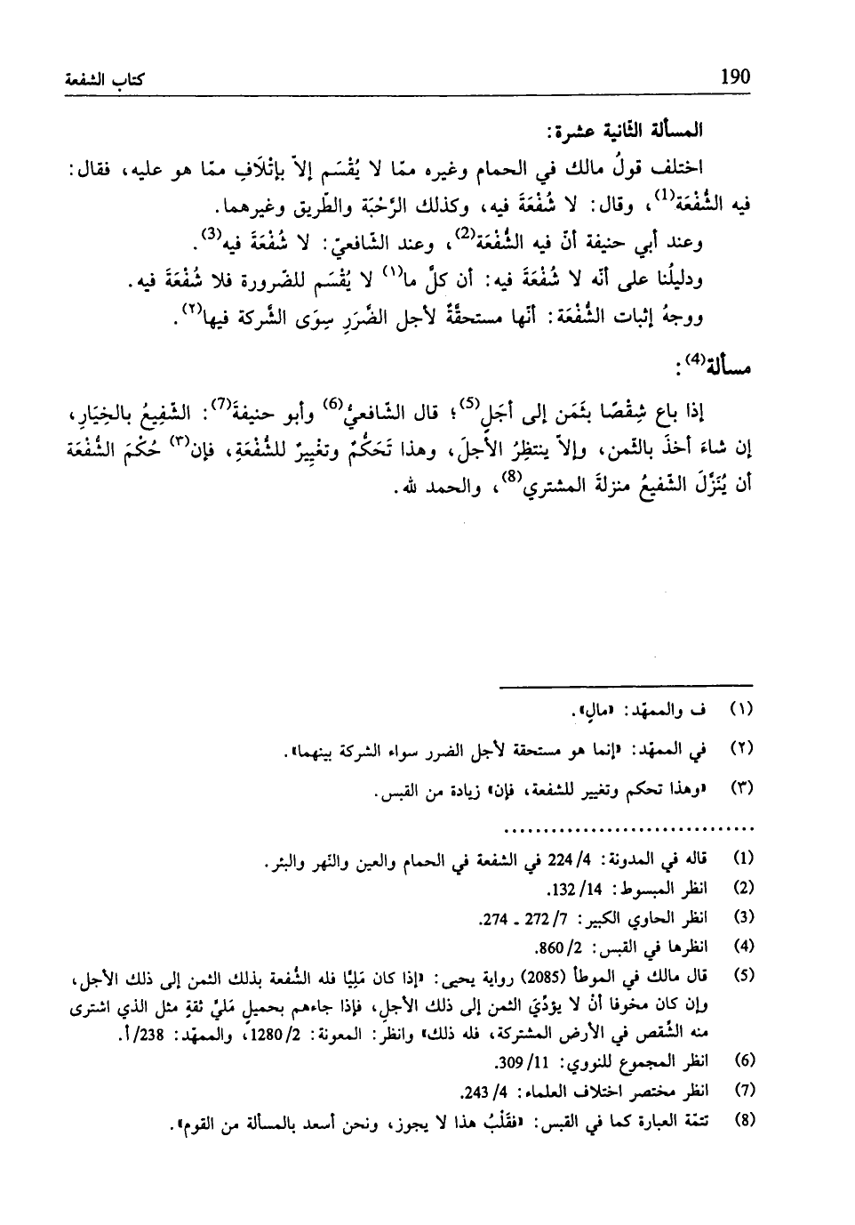 (¬5) قال مالك في الموطَّأ (2085) رواية يحيى: "إذا كان مَلِيًّا فله الشُّفعَةِ بذلك الثّمن إلى ذلك الأجل، وإن كان مخوفًا أنّ لا يؤدِّيَ الثّمن إلى ذلك الأجل، فهذا جاءهم بحميلٍ مَليَّ ثقةٍ مثل الّذي اشترى منه الشَّقص في الأرض المشتركة، فله ذلك" وانظر: المعونة: 2/ 1280، والممهّد: 238/ أ.