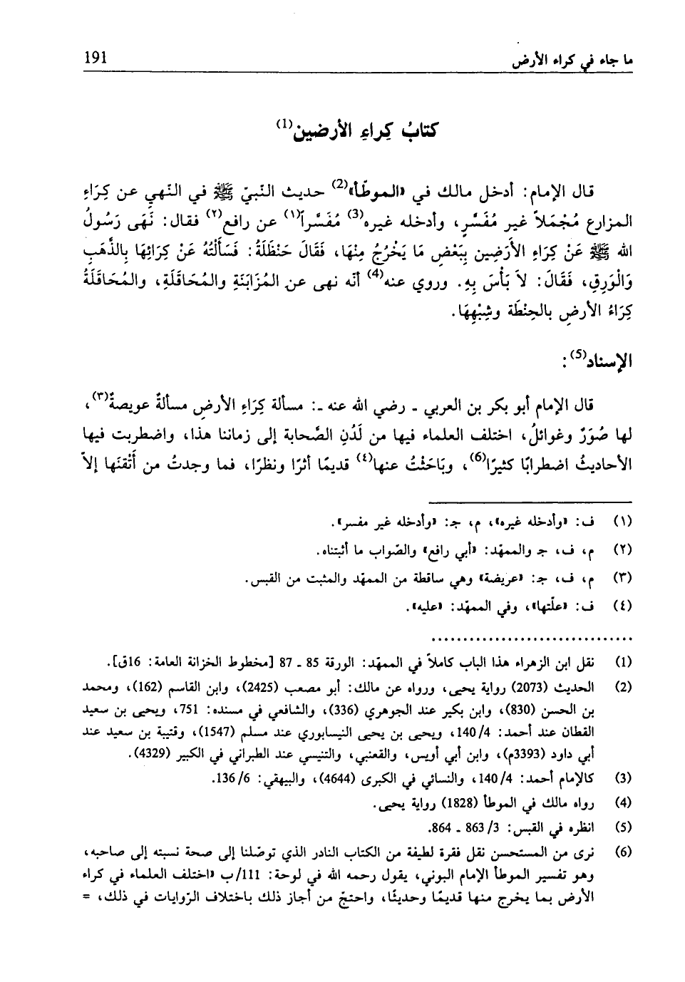 (¬6) نرى من المستحسن نقل فقرة لطيفة من الكتاب النادر الّذي توصّلنا إلى صحة نسبته إلى صاحبه، وهو تفسير الموطَّأ الإمام البوني، يقول رحمه الله في لوحة: 111/ ب "اختلف العلماء في كراء الأرض بما يخرج منها قديمًا وحديثًا، واحتجّ من أجاز ذلك باختلاف الرّوايات في ذلك،=