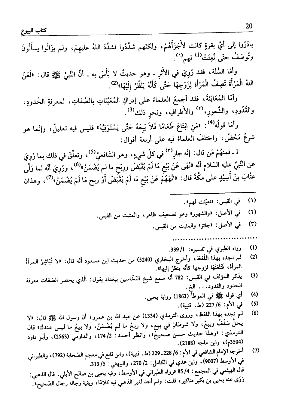 (¬6) لم نجده بهذا اللفظ، وروى التّرمذيّ (1334) عن عبد الله بن عمرو؛ أنّ رسول الله - صلّى الله عليه وسلم - قال:"لا يحلُّ سَلَفٌ وبيعٌ، ولا شرطانِ في بيعٍ، ولا ربحُ ما لم يُضْمَنُ، ولا بيعُ ما ليس عندك" قال التّرمذيّ: "وهذا حديث حسن صحيح"، وانظر أحمد: 2/ 174، والدارمي (2563)، وأبو داود (3504 م)، وابن ماجه (2188).