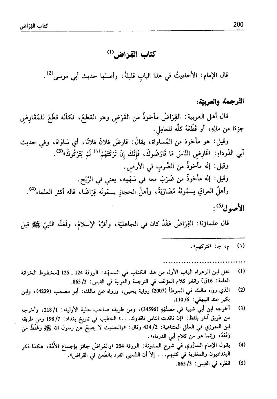 (¬4) يقول الإمام المازَري في شرح المدوّنة: الورقة 204 "والقراضُ جائز بإجماع الأُمَّة، هكذا ذكر البغداديون والمغاربة في كتبهم ... إِلَّا أنّ الشّعبيّ انفرد بالطّعن في القراض".