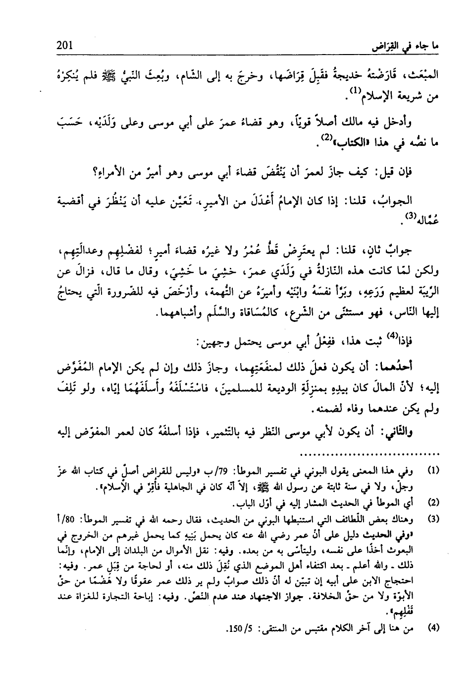 (¬1) وفي هذا المعنى يقول البوني في تفسير الموطَّأ: 79/ ب "وليس للقراض أصلٌ في كتابُ الله عزَّ وجلَّ، ولا في سنة ثابتة عن رسول الله - صلّى الله عليه وسلم -، إِلَّا أنّه كان في الجاهلية فأُقِرَّ في الإسلام".