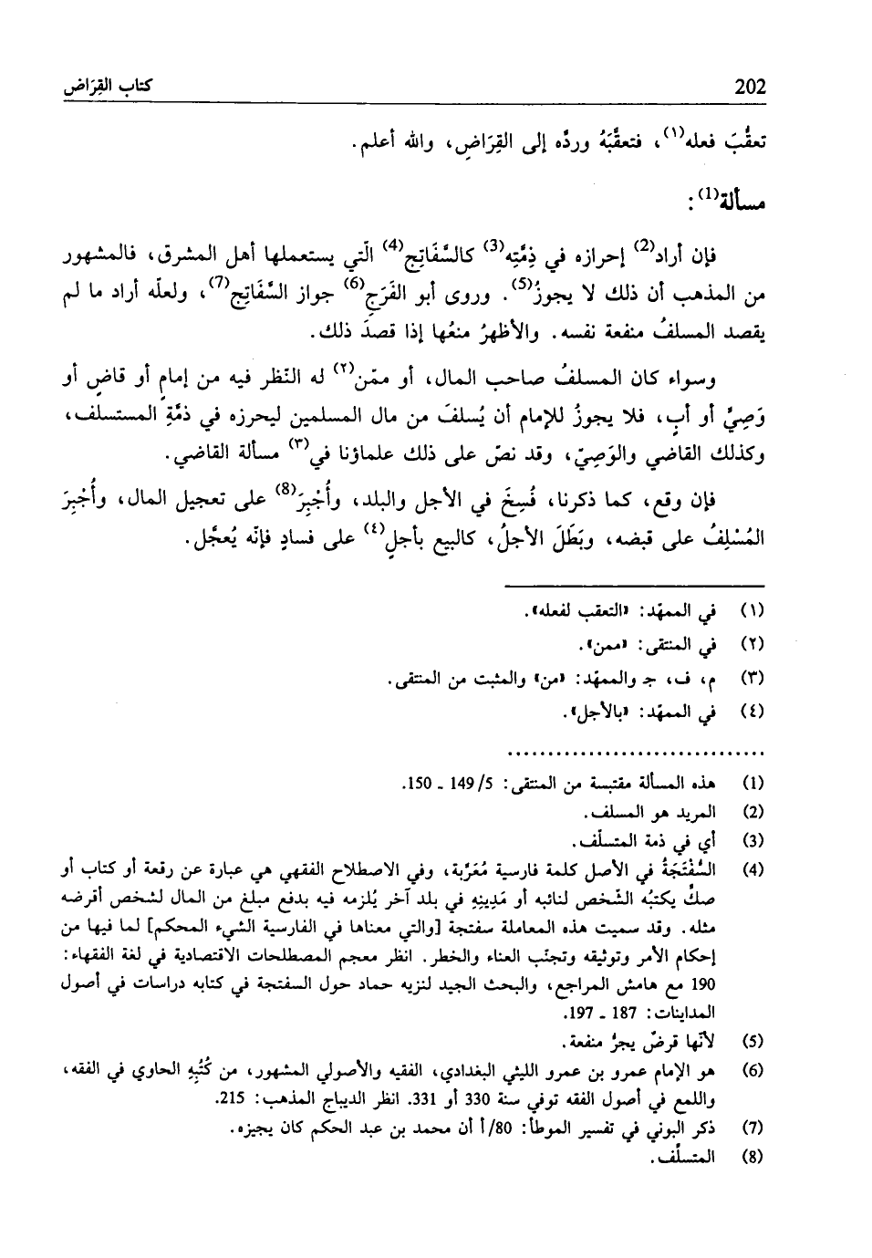 (¬4) السُّفتَجَةُ في الأصل كلمة فارسية مُعَرَّبة، وفي الاصطلاح الفقهي هي عبارة عن رقعة أو كتابُ أو صكَّ يكتبُه الشّخص لنائبه أو مَدِينِهِ في بلد آخر يُلزمه فيه بدفع مبلغ من المال لشخص أقرضه مثله. وقد سميت هذه المعاملة سفتجة [والتي معناها في الفارسية الشيء المحكم] لما فيها من إحكام الأمر وتوثيقه وتجنّب العناء والخطر. انظر معجم المصطلحات الاقتصادية في لغة الفقهاء: 190 مع هامش المراجع، والبحث الجيد لنزيه حماد حول السفتجة في كتابه دراسات في أصول المداينات: 187 - 197.