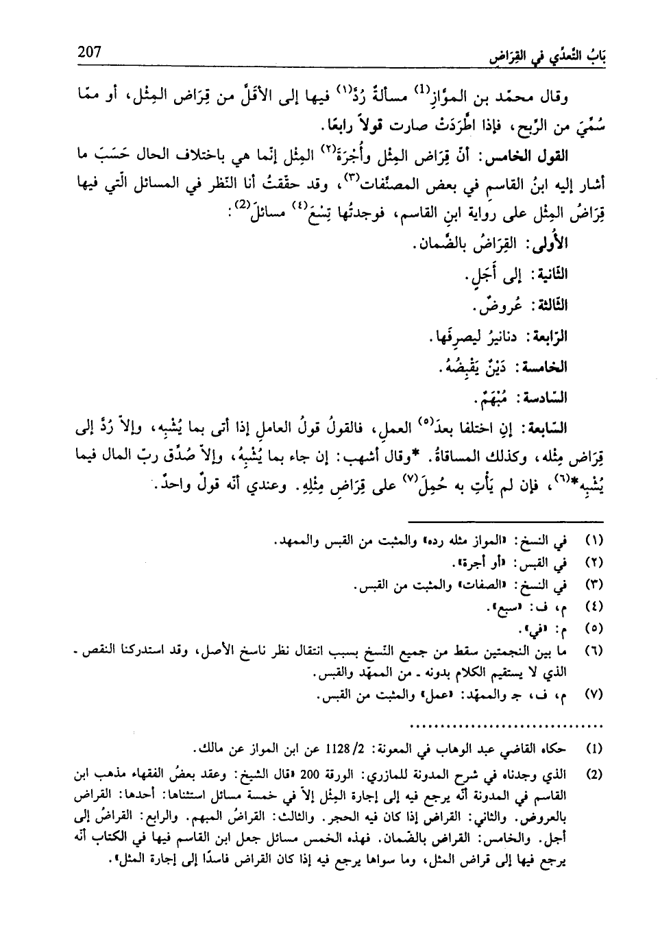 (¬2) الّذي وجدناه في شرح المدوّنة للمازري: الورقة 200 "قال الشّيخ: وعقد بعضُ الفقهاء مذهب ابن القاسم في المدوّنة أنّه يرجع فيه إلى إجارة المِثل إِلَّا في خمسة مسائل استثناها: أحدها: القراض بالعروض. والثّاني: القراض إذا كان فيه الحجر. والثّالث: القراضُ المبهم. والرّابع: القراضُ إلى أجل. والخامس: القراض بالضّمان. فهذه الخمس مسائل جعل ابن القاسم فيها في الكتاب أنّه يرجع فيها إلى قراض المثل، وما سواها يرجع فيه إذا كان القراض فاسدًا إلى إجارة المثل".