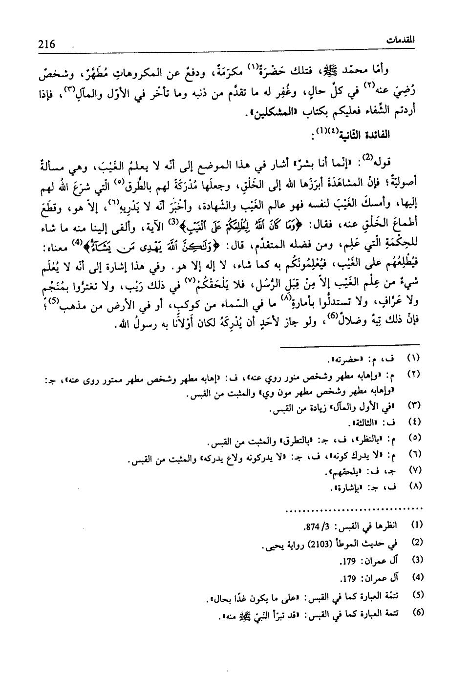 وأمّا محمّد - صلّى الله عليه وسلم -، فتلك حَضرَةٌ مكرمَةٌ، ودفع عن المكروهاتِ مُطَهَّر، وشخصٌ رُضِيَ عنه في كلِّ حالٍ، وغُفِر له ما تقدَّم من ذنبه وما تأخّر في الأوّل والمآل، فإذا أردتم الشِّفاء فعليكم بكتاب "المشكلين".
