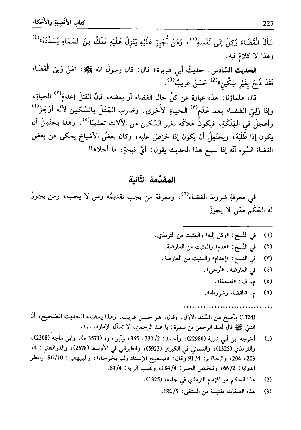 الحديث السّادس: حديثُ أبي هريرة؛ قال: قال رسولُ الله - صلّى الله عليه وسلم -:"مَنْ وَليَ القَضَاءَ فَقَد ذُبحَ بِغَيْر سِكِّينٍ" (¬2) حَسَنٌ غريبٌ (¬3).