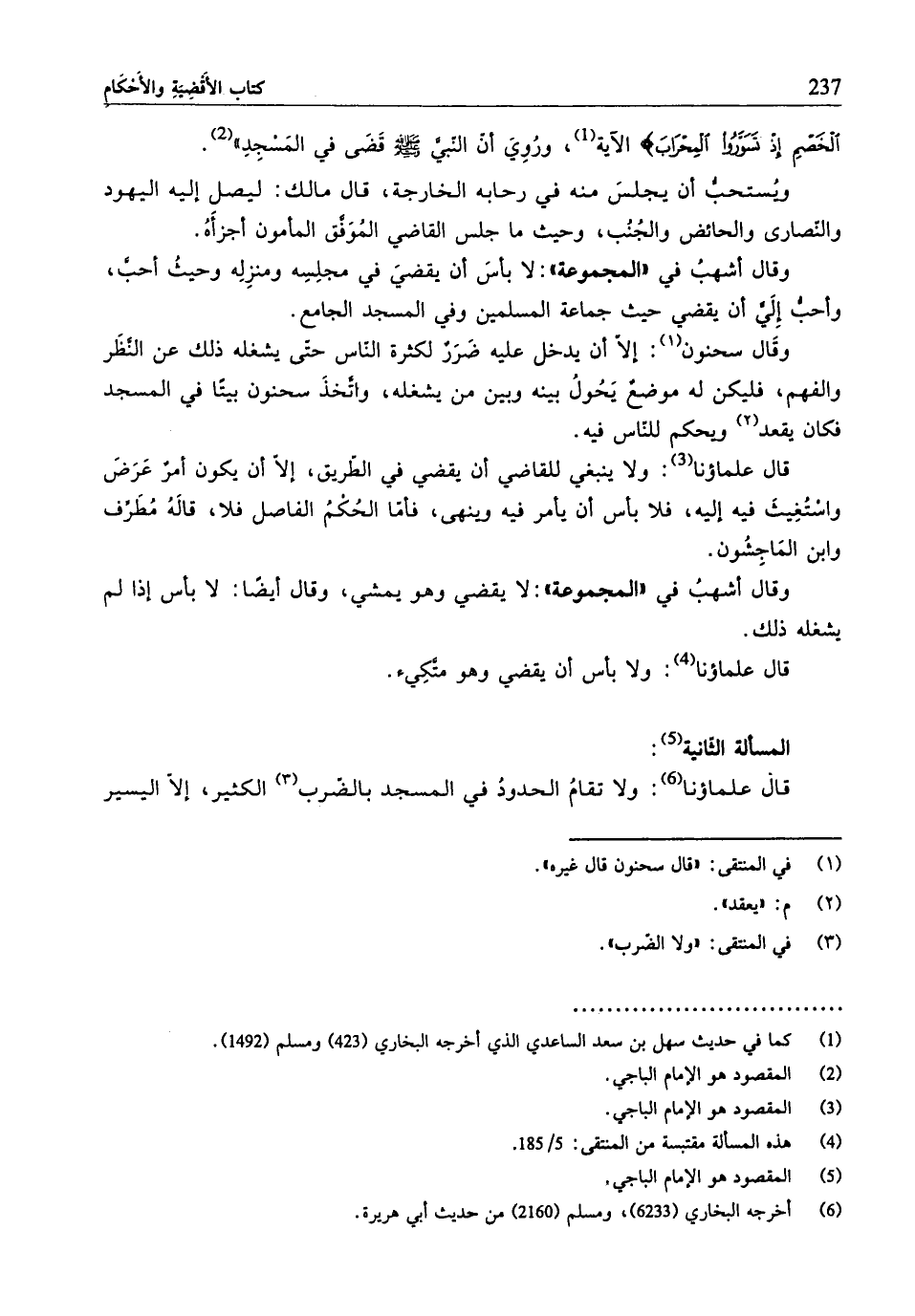 وقَال سحنون: إِلَّا أنّ يدخل عليه ضَرَرٌ لكثرة النَّاس حتّى يشغله ذلك عن النَّظَر والفهم، فليكن له موضعٌ يَحُولُ بينه وبين من يشغله، واتَّخذ سحنون بيتًا في المسجد فكان يقعد ويحكم للنّاس فيه.