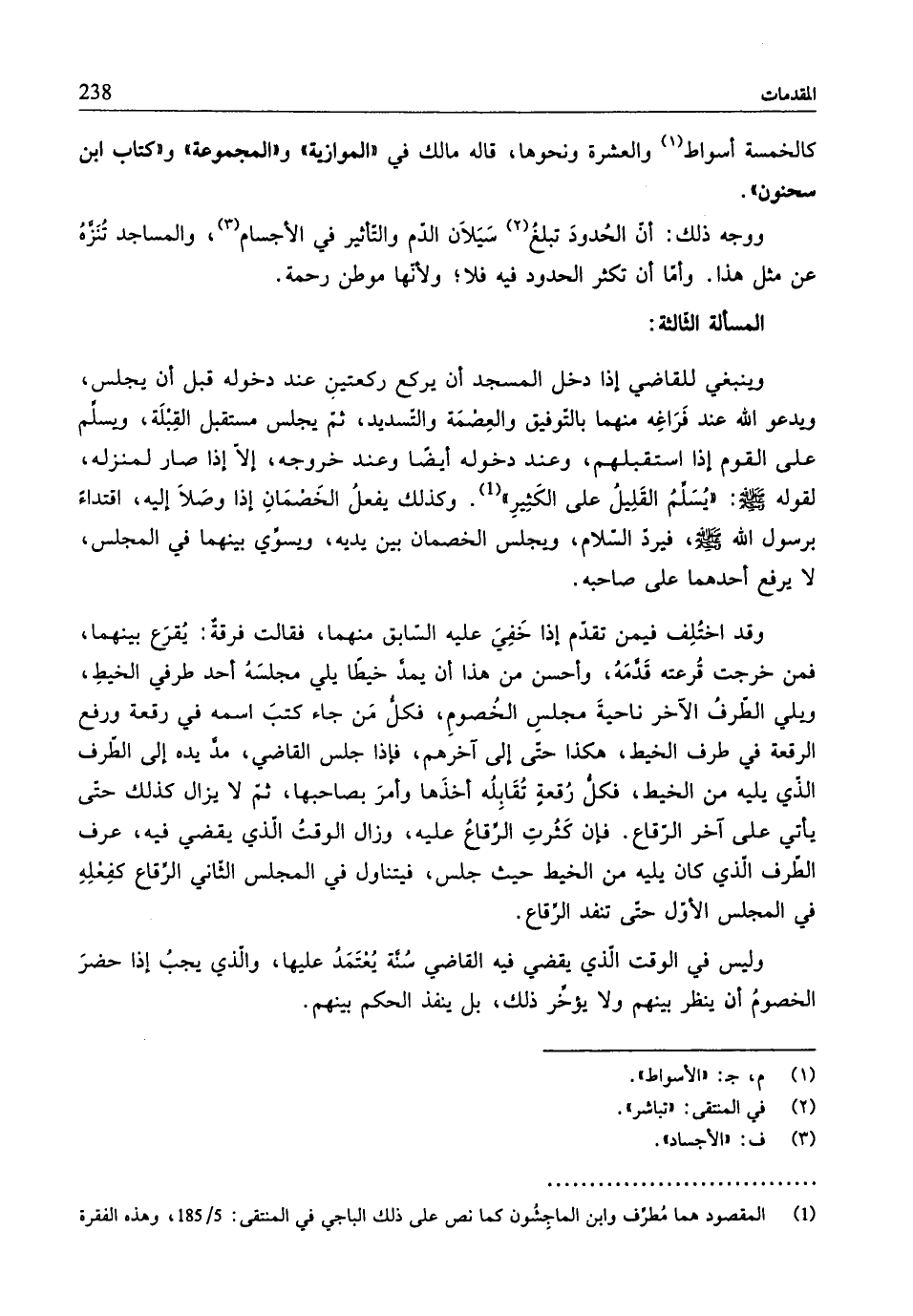 وينبغي للقاضي إذا دخل المسجد أنّ يركع ركعتين عند دخوله قبل أنّ يجلس، ويدعو الله عند فَرَاغِه منهما بالتّوفيق والعِصمَة والتّسديد، ثمّ يجلس مستقبل القِبلَة، ويسلِّم على القوم إذا استقبلهم، وعند دخوله أيضًا وعند خروجه، إِلَّا إذا صار لمنزله، لقوله - صلّى الله عليه وسلم -: "يُسَلِّمُ القَلِيلُ على الكَثِيرِ" (¬1). وكذلك يفعلُ الخَصمَانِ إذا وصَلَا إليه، اقتداءً برسول الله - صلّى الله عليه وسلم -، فيردّ السّلام، ويجلس الخصمان بين يديه، ويسوِّي بينهما في المجلس، لا يرفع أحدهما على صاحبه.