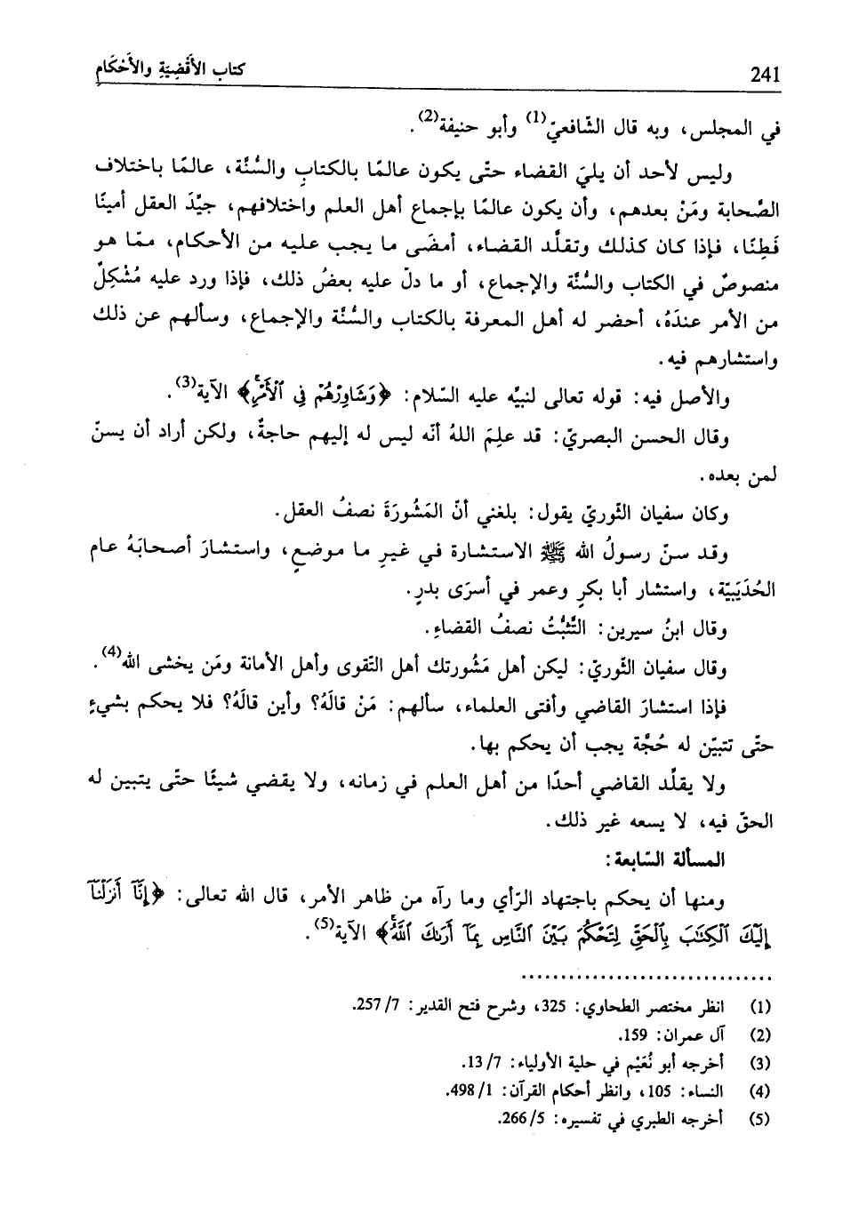 فإذا استشارَ القاضي وأفتى العلماء، سألهم: مَنْ قالَهُ؟ وأين قالَهُ؟ فلا يحكم بشيءٍ حتّى تتبيّن له حُجَّة يجب أنّ يحكم بها.