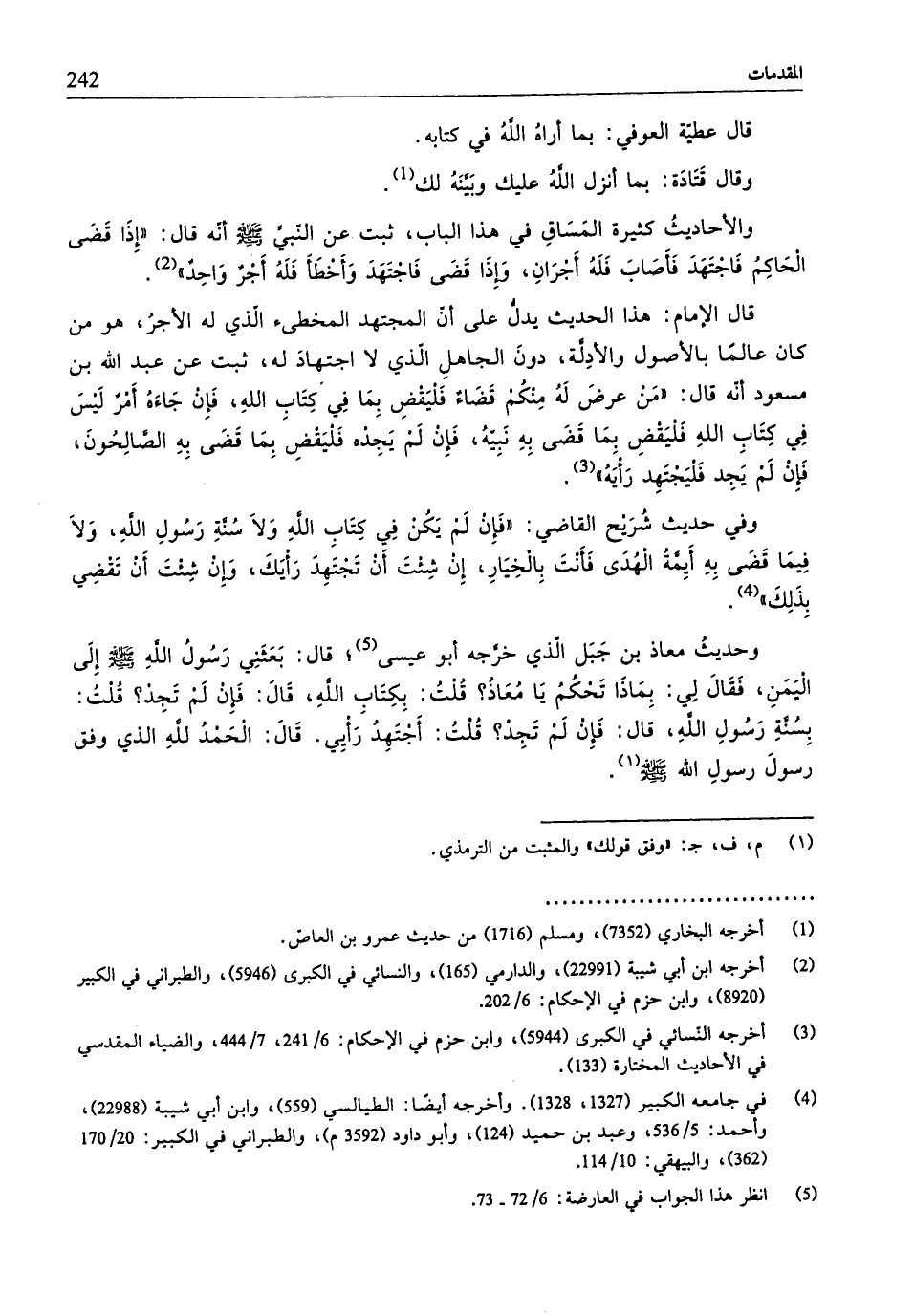 وحديثُ معاذ بن جَبَل الّذي خرَّجه أبو عيسى (¬5)؛ قال: بَعَثنِي رَسُولُ الله - صلّى الله عليه وسلم - إلى اليَمَنِ، فَقَالَ لِي: بِمَاذَا تَحكُمُ يَا مُعَاذُ؟ قُلتُ: بِكِتابِ اللهِ، قالَ: فَإِن لَمْ تَجِد؟ قُلتُ: بِسُنَّةِ رَسُولِ الله، قال: فَإِنْ لَمْ تَجِد؟ قُلتُ: أجتهِدُ رَأيِي. قَالَ: الْحَمْدُ للهِ الّذي وفق رسولَ رسولِ الله - صلّى الله عليه وسلم -.