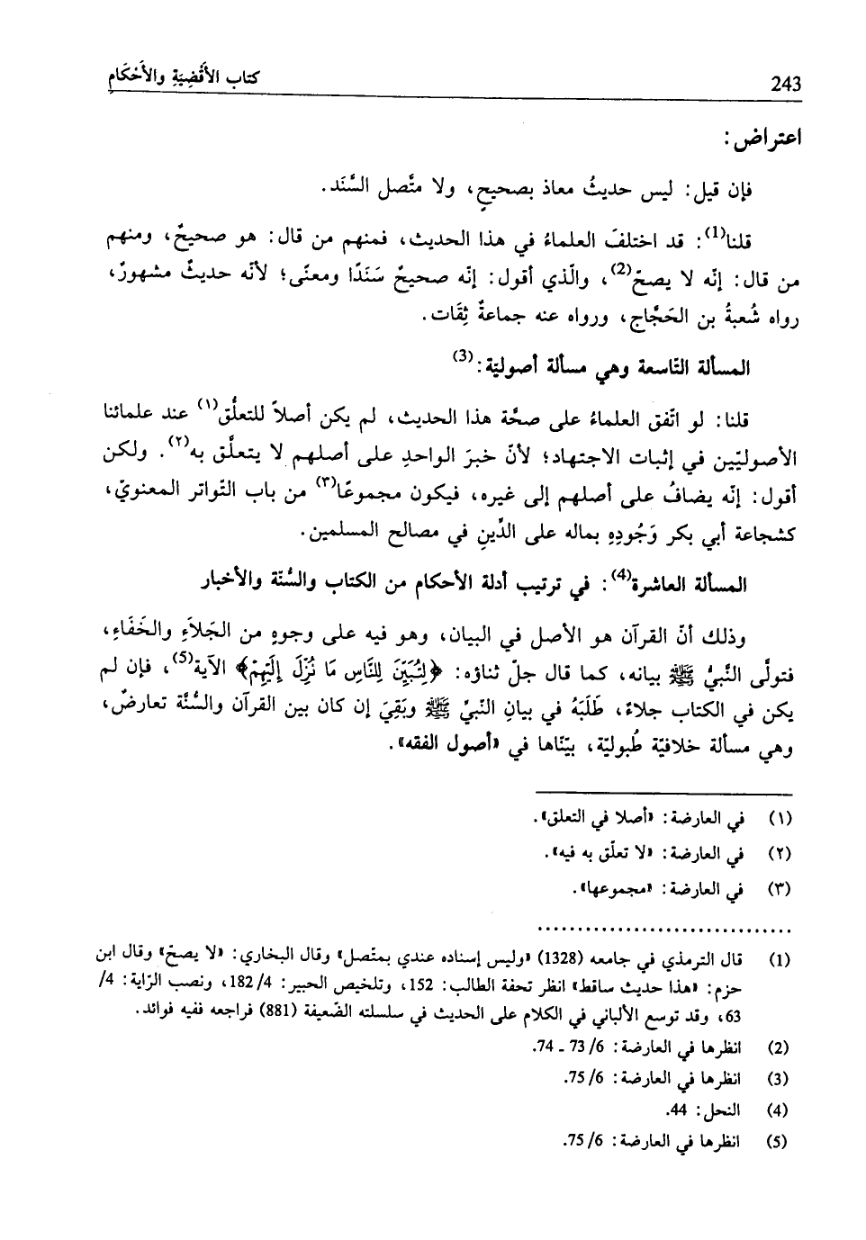 قلنا: لو اتّفق العلّماءُ على صحة هذا الحديث، لم يكن أصلًا للتعلُّق عند علمائنا الأصوليّين في إثبات الاجتهاد؛ لأنّ خبرَ الواحدِ على أصلهم لا يتعلَّق به. ولكن أقول: إنّه يضافُ على أصلهم إلى غيره، فيكون مجموعًا من باب التّواتر المعنويّ، كشجاعة أبي بكر وَجُودِهِ بماله على الدِّينِ في مصالح المسلمين.