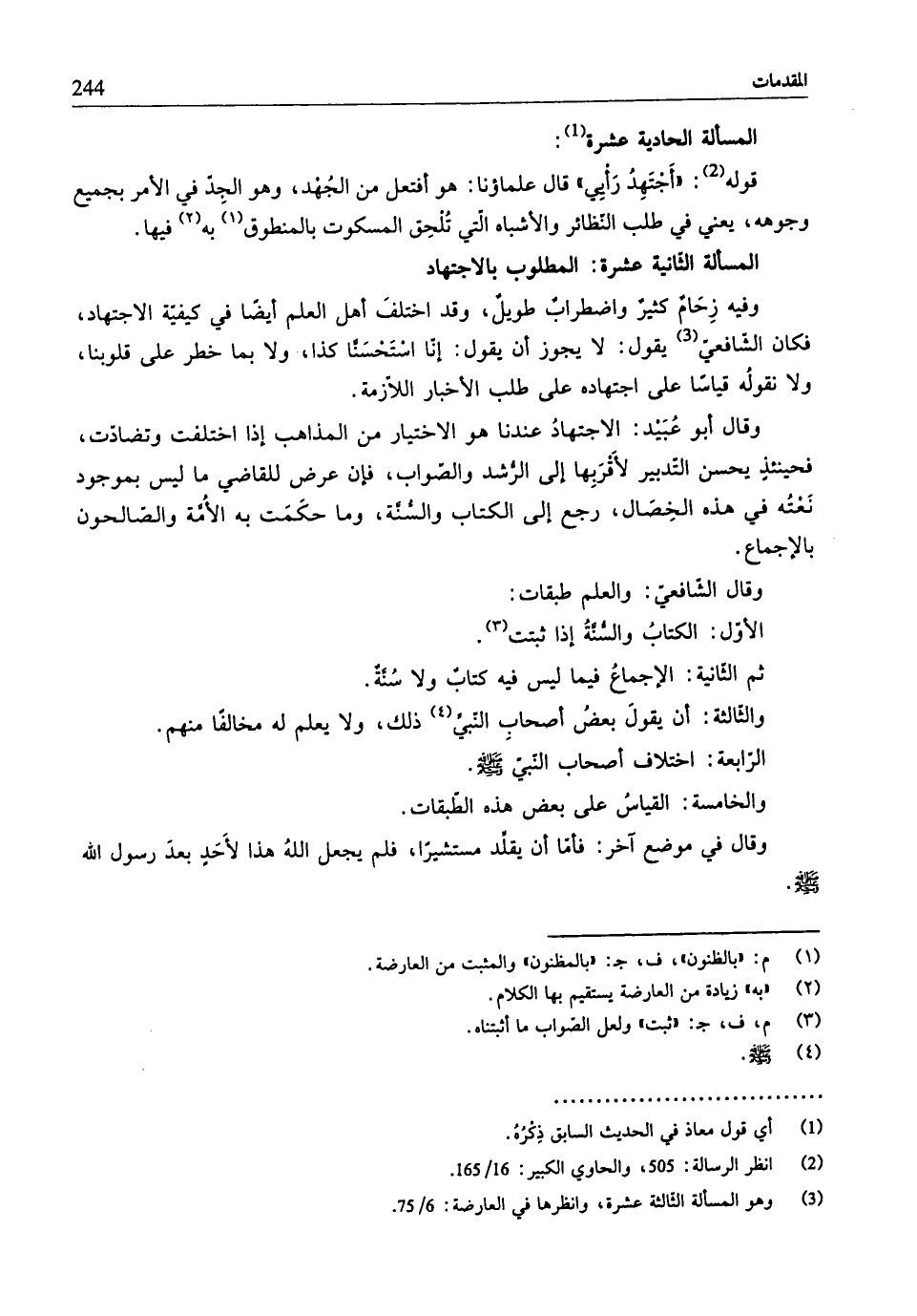 وفيه زِحَامٌ كثيرٌ واضطرابٌ طويلٌ، وقد اختلفَ أهل العلم أيضًا في كيفيّة الاجتهاد، فكان الشّافعيّ (¬3) يقول: لا يجوز أنّ يقول: إنّا استَحسَنَّا كذا , ولا بما خطر على قلوبنا، ولا نقولُه قياسًا على اجتهاده على طلب الأخبار اللّازمة.