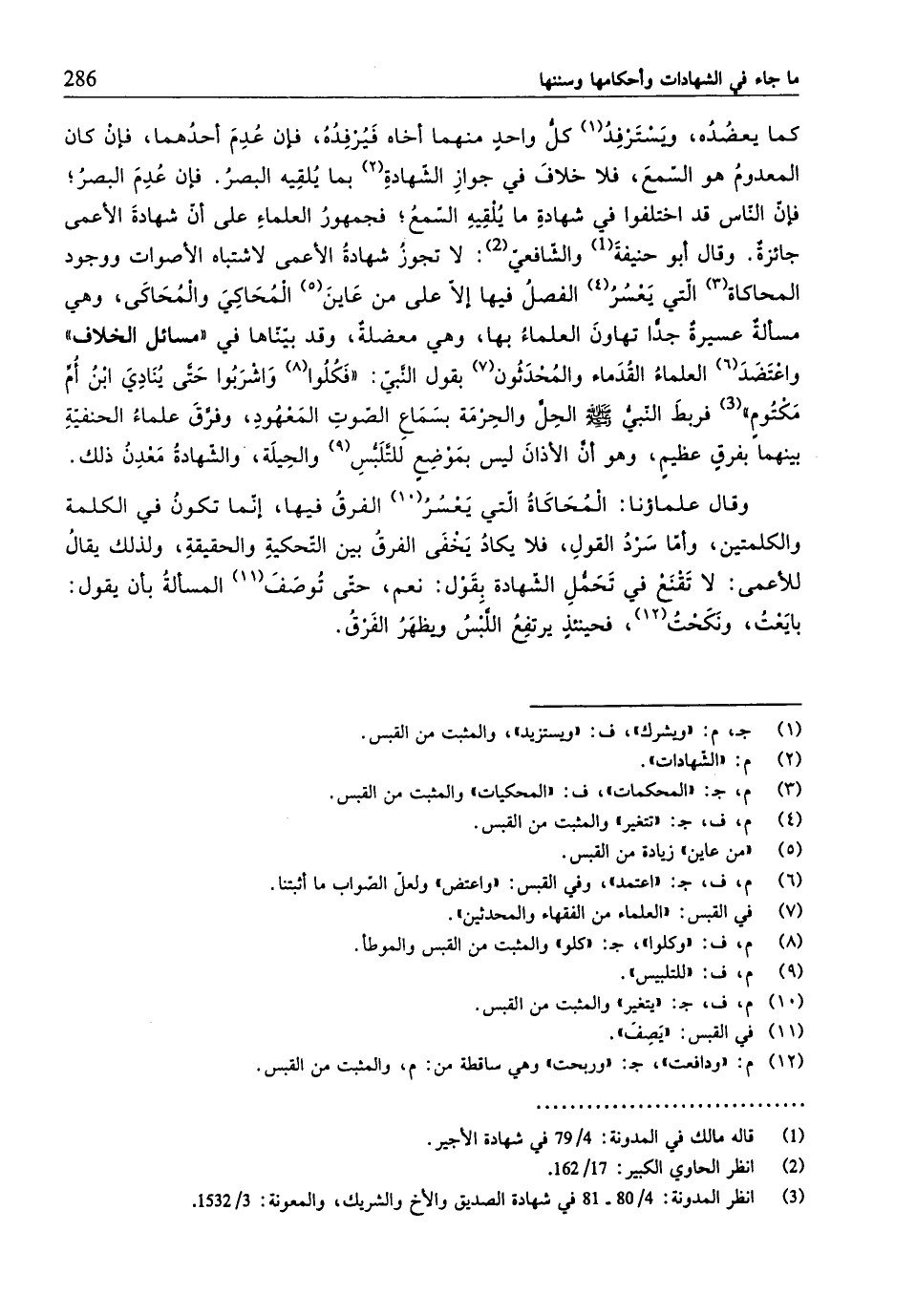 وقال علماؤنا: الْمُحَاكَاةُ الّتي يَعسُرُ الفرقُ فيها، إنّما تكونُ في الكلمة والكلمتين، وأمّا سَردُ القولِ، فلا يكادُ يَخفَى الفرقُ بين التّحكيةِ والحقيقةِ، ولذلك يقالُ للأعمى: لا تَقنَع في تحَمُّلِ الشّهادة بِقَول: نعم، حتّى تُوصَفَ المسألةُ بأن يقول: بايَعتُ، ونَكَحتُ، فحينئذٍ يرتفِعُ اللَّبسُ ويظهَرُ الفَرْقُ.