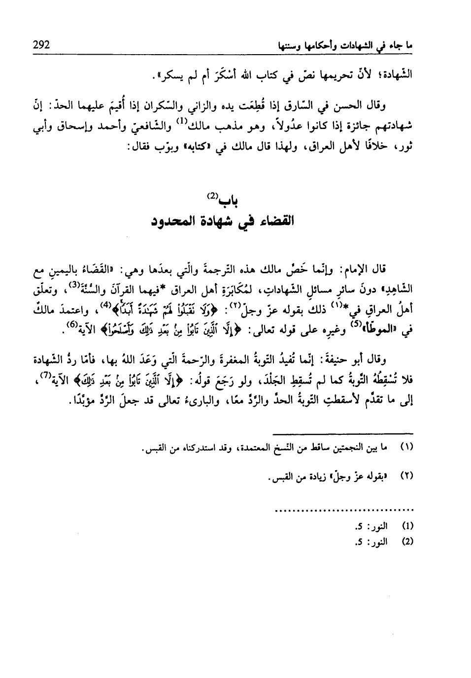 قال الإمام: وإنّما خَصَّ مالك هذه التّرجمةَ والتي بعدَها وهي: "القَضَاءُ باليمينِ مع الشّاهِد" دونَ سائرِ مسائلِ الشّهاداتِ، لمُكَابرةِ أهل العراق* فيهما القرآنَ والسُّنَّةَ (¬3)، وتعلّق أهلُ العراقِ في* ذلك بقوله عَزَّ وَجَلَّ: {وَلَا تَقْبَلُوا لَهُمْ شَهَادَةً أَبَدًا} (¬4)، واعتمدَ مالك في "الموطَّأ" (¬5) وغيرِه على قوله تعالى: {إِلَّا الَّذِينَ تَابُوا مِنْ بَعْدِ ذَلِكَ وَأَصْلَحُوا} الآية (¬6).