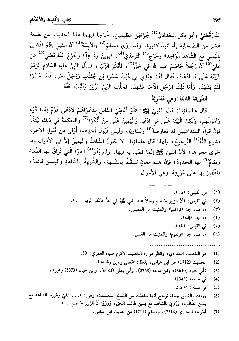 (¬6) وردت بالقبس جملة نرجّح أنّها سقطت من النّسخ المعتمدة، وهي: " ... عليّ وغيره بالشّاهد مع يمين الطّالب، وَرُوِيَ بالشّاهد مع يمين طالب الحق، وَرَوَوْا أنّ الزُّبير خاصم ... ".
