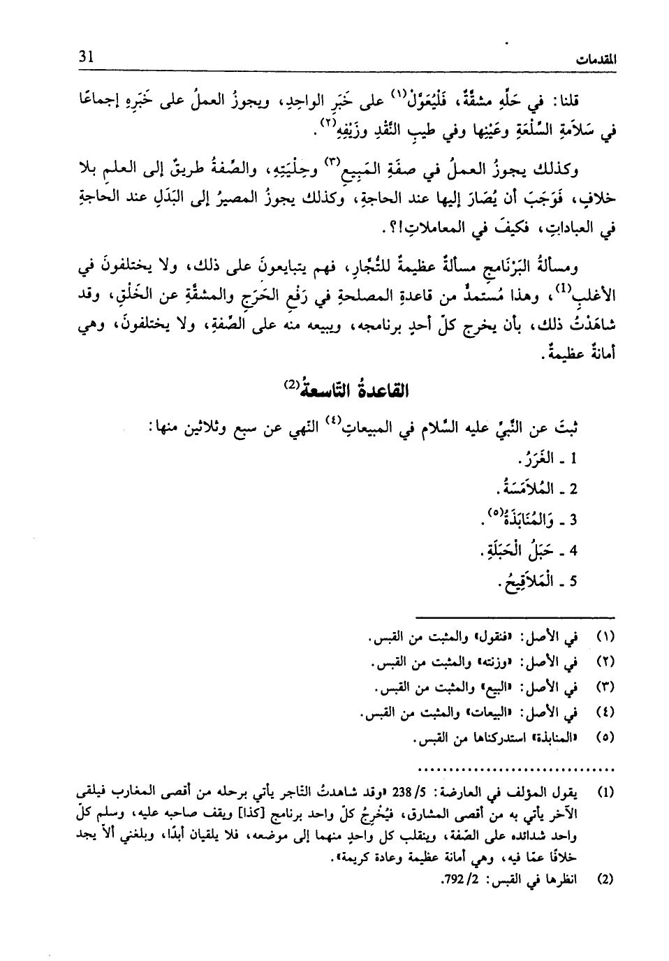 ومسألةُ البَرْنَامجِ مسألةٌ عظيمةٌ للتُّجَّارِ، فهم يتبايعونَ على ذلك، ولا يختلفونَ في الأغلبِ (¬1)، وهذا مُستمدٌ من قاعدةِ المصلحةِ في رَفْعِ الحَرَجِ والمشقَّةِ عن الخلْقِ، وقد شاهَدْتُ ذلك، بأن يخرج كلّ أحدٍ برنامجه، ويبيعه منه على الصِّفةِ, ولا يختلفونَ، وهي أمانةٌ عظيمةٌ.